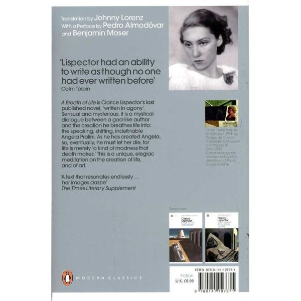 A Breath of Life is Clarice Lispector’s final novel, ‘written in agony’, which she did not live to see published. Sensual and mysterious, it is a mystical dialogue between a god-like author and the creation he breathes life into: the speaking, shifting, indefinable Angela Pralini. As he has created Angela, so, eventually, he must let her die, for life is merely ‘a kind of madness that death makes.’ This is a unique, elegiac meditation on the creation of life, and of art.