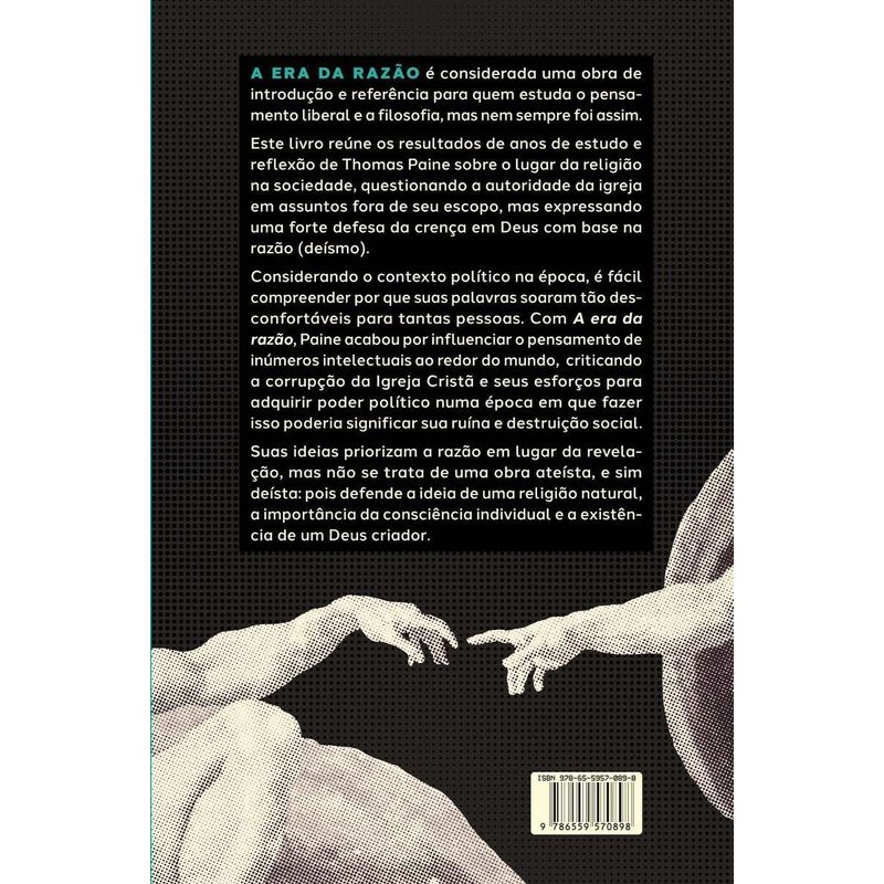 A era da razão é considerada uma obra de introdução e referência para quem estuda o pensamento liberal e a filosofia, mas nem sempre foi assim. Este livro reúne os resultados de anos de estudo e reflexão de Thomas Paine sobre o lugar da religião na sociedade, questionando a autoridade da igreja em assuntos fora de seu escopo, mas expressando uma forte defesa da crença em Deus com base na razão (deísmo). Considerando o contexto político na época, é fácil compreender por que suas palavras soaram tão desconfortáveis para tantas pessoas. Com A era da razão, Paine acabou por influenciar o pensamento de inúmeros intelectuais ao redor do mundo, criticando a corrupção da Igreja Cristã e seus esforços para adquirir poder político numa época em que fazer isso poderia significar sua ruína e destruição social. Suas ideias priorizam a razão em lugar da revelação, mas não se trata de uma obra ateísta, e sim deísta: pois defende a ideia de uma religião natural, a importância da consciência individual e a existência de um Deus criador. “A arma mais formidável contra todos os tipos de erros é a razão.” — Thomas Paine