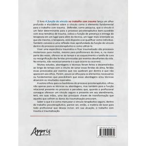 O livro A função do vínculo no trabalho com trauma lança um olhar profundo e elucidativo sobre o vínculo como o elemento fundamental para o trabalho com trauma. Defender, como pesquisa, que o vínculo é um fator determinante para o processo psicoterapêutico bem-sucedido com essa temática de trauma, coloca a função de presença e entrega do terapeuta em um lugar para além da técnica, um lugar mais orientado ao que ele mesmo, o terapeuta, está disposto a se qualificar como indivíduo. Também convoca a uma reflexão mais aprofundada da função do vínculo dentro do processo psicoterapêutico e como utilizá-lo. Viver uma experiência traumática e ficar traumatizado são processos misteriosos para muitos, mesmo para profissionais da área, e, na maior parte das vezes, oferece-se ao tempo e ao esquecimento a tarefa de cura ou ressignificação das feridas provocadas por eventos desafiantes da vida. No entanto, não necessariamente é o que ocorre ou ocorrerá. Muitos estudos, abordagens e técnicas foram feitos e desenvolvidos ao longo do tempo com o intuito de sanar essas feridas da alma, feridas essas provocadas por eventos que nos quebram por dentro e que não aparecem aos olhos. Porém, pouco se olha para os elementos necessários ou fundamentais que possibilitem que essas abordagens e/ou técnicas alcancem os resultados esperados. A autora olhou para os bastidores do processo psicoterapêutico, olhou não apenas para as técnicas ou abordagens, mas também para a função relacional presente no processo e percebeu que, quando o profissional consegue oferecer um vínculo seguro e presente em seu atendimento, terá, em suas mãos, uma das principais chaves de transformação que aqueles que sofrem os danos da traumatização procuram. Saber o que é e como manusear o vínculo terapêutico seguro, dentro do trabalho psicoterapêutico, parece ser, então, a matéria de base para todo profissional que deseja incluir, em sua atuação, o trabalho com trauma e traumatização.