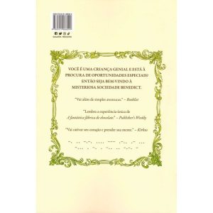 O poder da mídia e da propaganda e o valor da educação costuram a trama da divertida — e bem sucedida (na lista do New York Times por 50 semanas) — estréia de Trenton Lee Stewart no universo das histórias infanto-juvenis. Em meio a muita ação e aventura, A MISTERIOSA SOCIEDADE BENEDICT trata, ainda, da natureza da amizade, lealdade, coragem e liderança. Quatro crianças solitárias e tímidas precisam aprender a confiar umas nas outras e trabalhar juntas para atingir seus objetivos. Cada uma delas possui um dom único e especial. Nada fantasioso como poderes sobrenaturais ou habilidades adquiridas através de insetos radioativos. Elas se destacam num quesito muito humano: vencer dificuldades, das mais variadas formas. Reynie é excelente na resolução de problemas, dedução lógica e leitura de pessoas. Ele é extraordinário em ler nas entrelinhas, observar, questionar e chegar ao âmago da questão. Sticky tem memória fotográfica: lembra de tudo o que lê. Kate é extremamente ágil e atlética. Carrega sempre consigo um balde contendo um kit emergencial: canivete suíço, cola, corda, lanterna, ímã, borracha e caneta. Constance é a clássica “do contra”, discordando sempre de tudo e de todos. Muito obstinada, beirando a teimosia, ela tem grande talento para escrever poemas, montar charadas e criar enigmas. Quando um anúncio um tanto estranho aparece no jornal em busca de crianças espertas para fazer uma série de provas misteriosas e complicadíssimas, que o leitor também pode fazer, Reynie, Kate, Sticky e Constance, com seus talentos ímpares, acabam escolhidos para a Misteriosa Sociedade Benedict. Agora, eles são os únicos que poderão destruir um plano maligno que põe em risco todos os habitantes do planeta. Trenton Lee Stewart cria em A MISTERIOSA SOCIEDADE BENEDICT um livro divertido para estimular a leitura e, a reboque, ensinar às crianças valorosas lições. “Assim como os livros de Harry Potter, esta história vai além de simples aventuras.” Booklist“Lembra a experiência única de A fantástica fábrica de chocolate.” Publisher’s Weekly“Prende tanto corações quanto mentes dos fãs do estilo de Lemony Snicket.” Kirkus