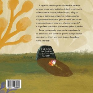 Com delicadeza, acolhimento e leveza, este é um livro que fala sobre um assunto para o qual dificilmente estamos preparados: a morte de alguém querido. A lagarta é uma amiga muito querida e presente no dia a dia de todos os insetos do jardim. Mas, como sabemos desde o começo desta história, a lagarta morreu, e agora seus amigos têm muitas perguntas. O que acontece quando a gente morre? Como vai ser a vida daqui para a frente, sem a lagarta por perto? E o que fazer com tudo o que eles sentem depois de sua perda? Os leitores podem encontrar algumas dessas respostas entre as lembranças e as conversas que os acompanham neste jardim. Com uma linguagem objetiva repleta de carisma e empatia, os autores deste livro propõem uma reflexão sobre o que é a morte — e como ela se relaciona com a vida, com a natureza e com os nossos sentimentos. Afinal, uma coisa é certa: despedidas não são fáceis, mas o acolhimento e o respeito às emoções fazem toda a diferença. Indicado para leitores a partir de 6 anos.