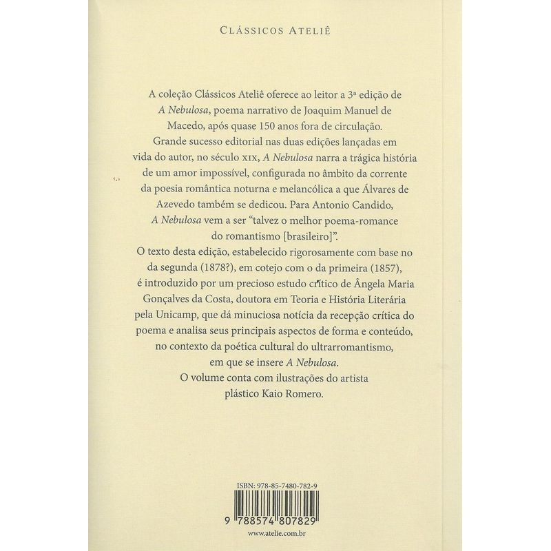 A coleção Clássicos Ateliê oferece ao leitor a 3ª edição de A Nebulosa, poema narrativo de Joaquim Manuel de Macedo, após quase 150 anos fora de circulação. Grande sucesso editorial nas duas edições lançadas em vida do autor, no século XIX, A Nebulosa narra a trágica história de um amor impossível, configurada no âmbito da corrente da poesia romântica noturna e melancólica a que Álvares de Azevedo também se dedicou. Para Antonio Candido, A Nebulosa vem a ser “talvez o melhor poema-romance do romantismo [brasileiro]”. O texto desta edição, estabelecido rigorosamente com base no da segunda (1878?), em cotejo com o da primeira (1857), é introduzido por um precioso estudo crítico de Ângela Maria Gonçalves da Costa, doutora em Teoria e História Literária pela Unicamp, que dá minuciosa notícia da recepção crítica do poema e analisa seus principais aspectos de forma e conteúdo, no contexto da poética cultural do ultrarromantismo, em que se insere A Nebulosa. O volume conta com ilustrações do artista plástico Kaio Romero.