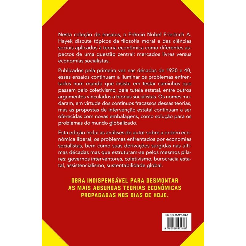 Nesta coleção de ensaios, o Prêmio Nobel Friedrich A. Hayek discute tópicos da filosofia moral e das ciências sociais aplicados à teoria econômica como diferentes aspectos de uma questão central: mercados livres versus economias socialistas. Publicados pela primeira vez nas décadas de 1930 e 40, esses ensaios continuam a iluminar os problemas enfrentados num mundo que insiste em testar caminhos que passam pelo coletivismo, pela tutela estatal, entre outros argumentos vinculados a teorias socialistas. Os nomes mudaram, em virtude dos contínuos fracassos dessas teorias, mas as propostas de intervenção estatal continuam a ser oferecidas com novas embalagens, como solução para os problemas do mundo globalizado. Esta edição inclui as análises do autor sobre a ordem econômica liberal, os problemas enfrentados por economias socialistas, bem como suas derivações surgidas nas últimas décadas, mas que se estruturam pelos mesmos pilares: governos interventores, coletivismo, burocracia estatal, assistencialismo e sustentabilidade global