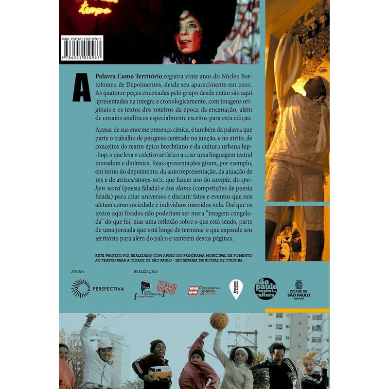 SINOPSE O teatro hip-hop traduz caleidoscopicamente o movimento e a cultura hip-hop: oralidade, resistência, invenção, mistura, política, música, dança, dramaturgia, improvisação, performance. O palco torna-se uma arena para o desenvolvimento de uma ação dramática completamente envolvida e definida pelas questões contemporâneas, do cotidiano ou dos grandes temas. Este livro celebra vinte anos de percurso do Núcleo Bartolomeu de Depoimentos e seu Teatro Hip-Hop, tornando impressas palavras, gestos, lutas e emoções que atravessaram as duas últimas décadas no país. Preparando o solo para os próximos vinte anos de luta e muito briho! QUARTA-CAPA A Palavra Como Território registra vinte anos do Núcleo Bartolomeu de Depoimentos, desde seu aparecimento em 2000. As quatorze peças encenadas pelo grupo desde então são aqui apresentadas na íntegra e cronologicamente, com imagens originais e os textos dos roteiros da época da encenação, além de ensaios analíticos especialmente escritos para esta edição. Apesar de sua enorme presença cênica, é também da palavra que parte esse trabalho de pesquisa centrado na junção, e no atrito, de conceitos do teatro épico brechtiano e da cultura urbana hip-hop, o que leva o coletivo artístico a criar uma linguagem teatral inovadora e dinâmica. Suas apresentações giram, por exemplo, em torno do depoimento, da autorrepresentação, da atuação de DJs e de atrizes/atores MCs, que fazem uso do sample, do spoken word (poesia falada) e dos slams (competições de poesia falada) para criar universos e discutir fatos e eventos que nos afetam como sociedade e indivíduos nela. Daí que os textos aqui fixados não poderiam ser mera “imagem congelada” do que foi, mas uma reflexão sobre o que está sendo, parte de uma jornada que está longe de terminar e que expande seu território para além do palco e também destas páginas. DA CAPA Imagem da capa: uma colagem de cenas do grupo em múltiplas ocasiões. Diversidade, visualidade rica e impactante, inventividade são apenas algumas das qualidades que cercam as apresentações do Núcleo Bartolomeu de Depoimentos em seus espetáculos.
