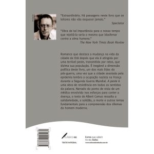 “Edição de bolso do romance de um dos mais importantes e representativos autores do século XX e ganhador do Prêmio Nobel de Literatura A peste que destaca a mudança na vida da cidade de Orã, na Argélia, depois que ela é atingida por uma terrível peste, transmitida por ratos, que dizima a população. É inegável a dimensão política deste livro, um dos mais lidos do pós-guerra, uma vez que a cidade assolada pela epidemia lembra a ocupação nazista na França durante a Segunda Guerra Mundial. A peste é uma obra de resistência em todos os sentidos da palavra. Narrado do ponto de vista de um médico envolvido nos esforços para conter a doença, o texto de Albert Camus ressalta a solidariedade, a solidão, a morte e outros temas fundamentais para a compreensão dos dilemas do homem moderno. “