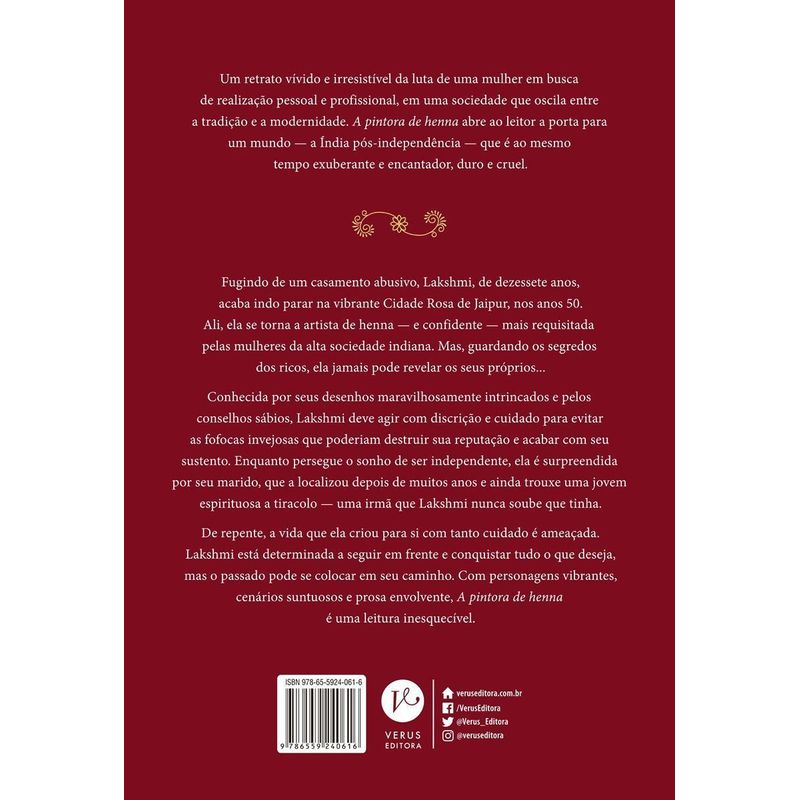 Um retrato vívido e irresistível da luta de uma mulher em busca de realização pessoal e profissional, em uma sociedade que oscila entre a tradição e a modernidade. A pintora de henna abre ao leitor a porta para um mundo — a Índia pós-independência — que é ao mesmo tempo exuberante e encantador, duro e cruel. Fugindo de um casamento abusivo, Lakshmi, de dezessete anos, acaba indo parar na vibrante Cidade Rosa de Jaipur, nos anos 50. Ali, ela se torna a artista de henna — e confidente — mais requisitada pelas mulheres da alta sociedade indiana. Mas, guardando os segredos dos ricos, ela jamais pode revelar os seus próprios…Conhecida por seus desenhos maravilhosamente intrincados e pelos conselhos sábios, Lakshmi deve agir com discrição e cuidado para evitar as fofocas invejosas que poderiam destruir sua reputação e acabar com seu sustento. Enquanto persegue o sonho de ser independente, ela é surpreendida por seu marido, que a localizou depois de muitos anos e ainda trouxe uma jovem espirituosa a tiracolo — uma irmã que Lakshmi nunca soube que tinha.De repente, a vida que ela criou para si com tanto cuidado é ameaçada. Lakshmi está determinada a seguir em frente e conquistar tudo o que deseja, mas o passado pode se colocar em seu caminho. Com personagens vibrantes, cenários suntuosos e prosa envolvente, A pintora de henna é uma leitura inesquecível. “Rico em detalhes e cheio de sabores e texturas, A pintora de henna é um fabuloso vislumbre da cultura indiana nos anos 1950.” – BookPage“Um livro eloquente e emocionante… Joshi equilibra com maestria o desejo de autodescoberta com a necessidade de amor familiar.” – Publishers Weekly“Um romance de estreia admirável e interessante sobre um tema necessário — o equilíbrio entre família e ambição pessoal —, que permite aos leitores escapar para um lugar repleto de prazeres sensoriais.” – San Francisco Chronicle“Joshi construiu um vislumbre fascinante do passado, com uma heroína obstinada pela qual vale a pena torcer.” – Booklist“Uma história inspiradora que salienta o poder da família. Para fãs dos romances de Kristin Hannah.” – Library Journal
