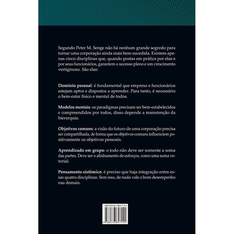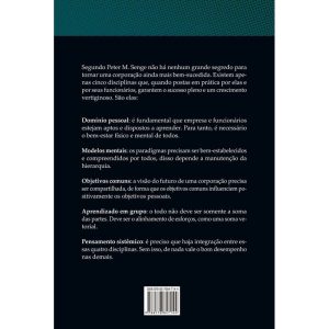 “Considerado pelo Financial Times um dos cinco maiores livros de negócios de todos os tempos, este livro apresenta técnicas imprescindíveis para uma organização empresarial de sucesso. Em uma época na qual as decisões eram centralizadas nos gerentes e o planejamento era feito a curto prazo, Senge derrubou o tabu do trabalho em equipe e disseminou novos padrões de pensamento no meio corporativo. Publicado pela primeira vez em 1990, o autor escreveu seis novos capítulos a partir de exemplos práticos da implantação de seus argumentos. Empresas como Unilever e Banco Mundial utilizaram as estratégias da “organização que aprende” para eliminar as deficiências de comunicação e aprendizagem que limitavam o crescimento futuro. A quinta disciplina definiu o novo papel dos líderes em uma estrutura de trabalho descentralizadora. O livro traz programas de aprendizagem baseados em cinco importantes “disciplinas”: domínio pessoal, modelos mentais, visão compartilhada, aprendizagem em equipe e pensamento sistêmico. Segundo Senge, é vital que todas as disciplinas se desenvolvam em conjunto. “Por isso o pensamento sistêmico é a quinta disciplina, aquela que integra as outras, fundindo-as em um corpo coerente de teoria e prática. Ampliando cada uma das disciplinas, o pensamento sistêmico nos lembra continuamente que a soma das partes pode exceder o todo”, afirma o autor.