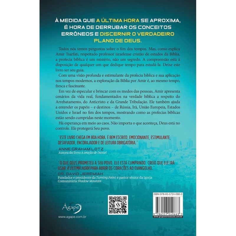 À medida que a última hora se aproxima, é hora de derrubar os conceitos errôneos e discernir o verdadeiro plano de Deus. Todos nós temos perguntas sobre o fim dos tempos. Mas, como explica Amir Tsarfati, respeitado professor israelense cristão de estudos da Bíblia, a profecia bíblica é um mistério, não um segredo. A compreensão está à disposição de qualquer um que dedique tempo para estudá-la. Deixe este livro ser seu guia. Com uma visão profunda e estimulante da profecia bíblica e sua aplicação nos tempos modernos, a exploração da Bíblia por Amir é, ao mesmo tempo, fresca e fascinante. Em vez de especular e brincar com os medos das pessoas, Amir apresenta cenários da vida real, fundamentados na verdade bíblica a respeito do Arrebatamento, do Anticristo e da Grande Tribulação. Ele também ajuda a entender os papéis – e destinos – de Rússia, Irã, União Europeia, Estados Unidos e Israel no fim dos tempos, mostrando como as profecias bíblicas estão sendo cumpridas neste momento. Há esperança em meio ao caos. Não importa o que aconteça, Deus está no controle. Ele protegerá Seu povo.