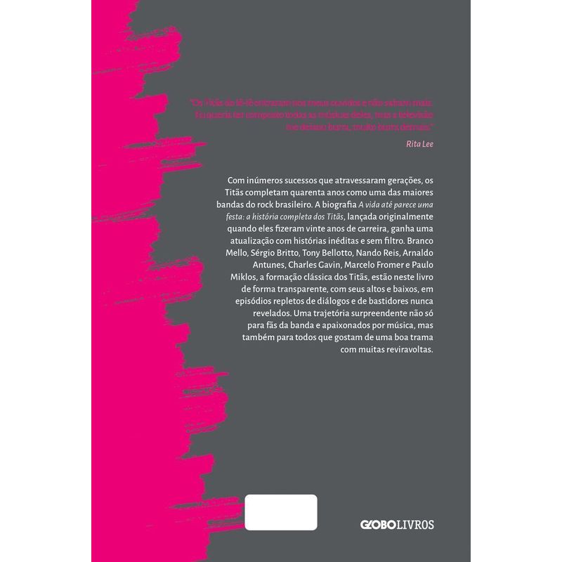 A vida até parece uma festa: a história completa dos Titãs comemora os 40 anos de uma das maiores bandas do rock brasileiro. O que fez os Titãs se tornarem um dos maiores expoentes do rock brasileiro e a se manterem ativos por quatro décadas? Essa biografia, lançada originalmente quando os Titãs completaram 20 anos, ganha dos autores e jornalistas Hérica Marmo e Luiz André Alzer, uma atualização cheia de histórias inéditas. Além da reunião da formação clássica dos Titãs – Branco Mello, Sérgio Britto, Tony Bellotto, Nando Reis, Charles Gavin, Marcelo Fromer, Arnaldo Antunes e Paulo Miklos –, os leitores têm acesso aos bons e maus momentos do grupo, de forma bastante transparente. Para contar em detalhes essa trajetória, os autores fizeram uma minuciosa pesquisa e entrevistaram todos os titãs e ex-titãs, além de mais de 50 personagens fundamentais na história da banda, que embala gerações com sucessos como “Marvin”, “Sonífera Ilha”, “Epitáfio” e “Homem Primata”. A vida até parece uma festa: a história completa dos Titãs é um livro não só para fãs e apaixonados por música, mas também para todos que gostam de uma trama com reviravoltas surpreendentes e emocionantes. O livro ainda traz imagens importantes que marcaram a carreira da banda.