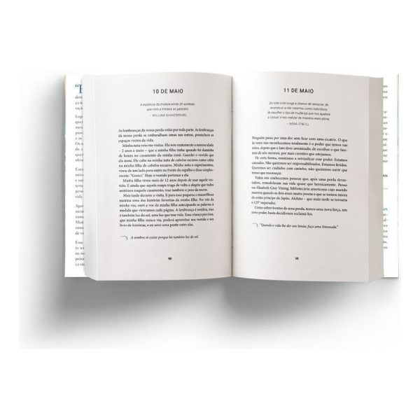 Publicado em diversos países e com mais de um milhão de exemplares vendidos, este livro reúne 365 mensagens inspiradoras para ajudar você a lidar com a morte de um ente querido. “Que eu saiba honrar os processos de luto e de cura e confiar neles, tendo a esperança de que, com o tempo, um novo dia chegará.” – Martha Hickman Quando perdemos alguém que amamos, iniciamos uma longa jornada, atravessando um dos períodos mais dolorosos da vida. Para nos oferecer um pouco de conforto, Martha Hickman compartilha meditações, frases inspiradoras e breves preces que lhe deram força e coragem para enfrentar a perda da filha, que morreu aos 16 anos num trágico acidente. Essas mensagens universais sobre vida, morte, amor, perda, dor e esperança ajudam a clarear a mente e a acalmar as turbulentas emoções. Com textos curtos e simples – o que é muito útil durante o luto, quando a capacidade de concentração e compreensão está reduzida –, este livro traz pequenas doses de encorajamento e apoio para cada dia do ano. Você pode seguir o calendário ou abri-lo de maneira aleatória para encontrar uma mensagem que lhe ajude em seu caminho.