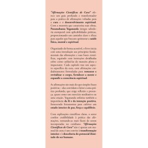 Afirmações Científicas de Cura é um guia revolucionário e transformador que oferece um caminho claro e eficaz para aqueles que desejam aprimorar a saúde física, mental e espiritual. Com a maestria única que caracteriza suas obras, Paramahansa Yogananda combina sabedoria atemporal com aplicabilidade prática, revelando como as afirmações podem ser uma poderosa ferramenta de cura e autodescoberta. Organizado de forma acessível e didática, o livro inicia com uma introdução aos princípios fundamentais das afirmações, explicando suas bases científicas e espirituais. A partir daí, oferece instruções detalhadas sobre como utilizar as afirmações de maneira profunda e impactante, criando uma verdadeira transformação interna. Cada capítulo é dedicado a um aspecto específico da cura, trazendo afirmações cuidadosamente formuladas para restaurar e revitalizar o corpo, fortalecer a mente e expandir a consciência espiritual. Com explicações científicas claras e acessíveis, Afirmações Científicas de Cura confere credibilidade a essa prática, tornando-a facilmente aplicável no cotidiano. Este não é apenas um manual de cura: é um convite para uma transformação interior profunda e para a descoberta do imenso potencial de cada ser humano. Ao seguir esse caminho, você não estará apenas curando o corpo e a mente, mas também desbloqueando uma nova dimensão de consciência e de possibilidades infinitas.