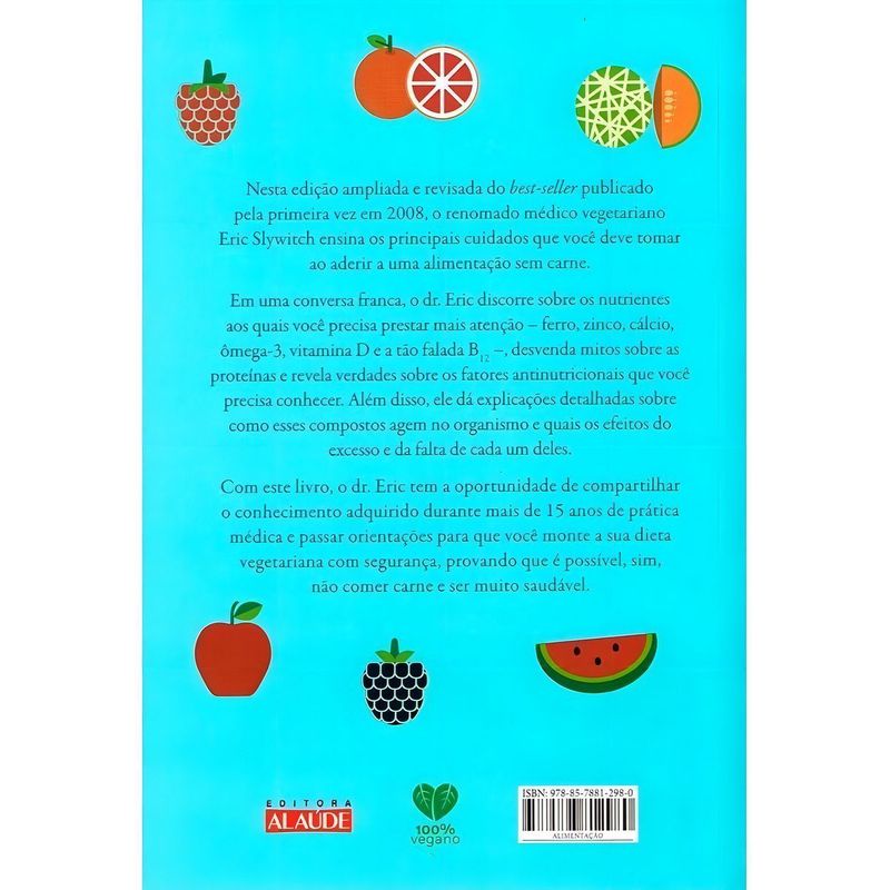 Em edição ampliada e revisada, o renomado médico vegetariano Eric Slywitch ensina todos os cuidados que deve manter ao aderir a uma alimentação sem carne. Em uma conversa franca, o autor discorre sobre importantes nutrientes, como ferro, zinco, cálcio, ômega-3, vitamina D e a tão falada B12, e demole todos os mitos sobre a proteína da carne. Além disso, dá explicações detalhadas sobre como todos esses compostos agem no organismo e quais os efeitos do excesso e da falta de cada um deles. Com mais de 20 anos de prática médica, o autor dá orientações para uma dieta vegetariana segura, provando que é possível, sim, não comer carne e ser muito saudável.