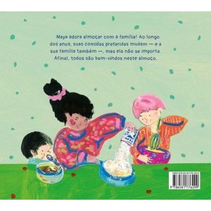 Neste livro ilustrado, Janaina Tokitaka convida leitores de todas as idades a refletirem sobre o que compõe uma família — e como o que importa é o amor estar sempre à mesa. Maya adora almoçar com a família! Ao longo dos anos, suas comidas preferidas mudam — e a sua família também —, mas ela não se importa. Afinal, todos são bem-vindos neste almoço. De maneira sutil e cheia de graça, este livro ilustrado apresenta uma família que, ao longo dos anos, toma novas formas, mas nunca deixa de se reunir para fazer o que há de mais gostoso na vida: comer junto! Indicado para leitores a partir de 4 anos.
