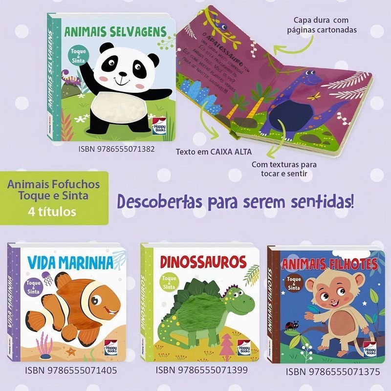 Vamos explorar o mundo animal com texturas para tocar e sentir? Junte-se à bicharada e divirta-se nesta charmosa coleção interativa.