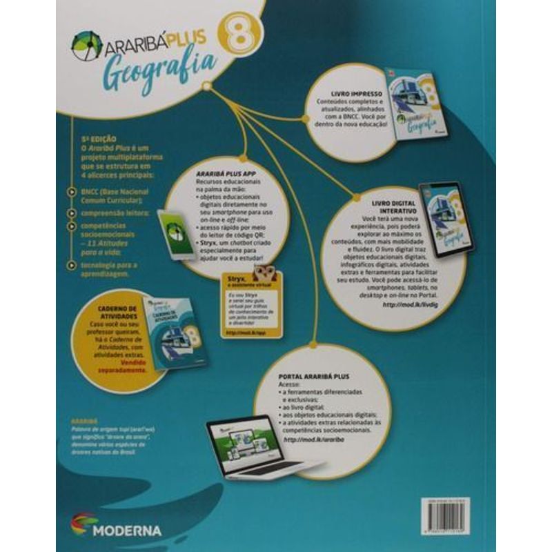 Araribá Plus Geografia 8º ano. O Projeto Araribá reuniu todas as suas experiências de sucesso com as metodologias mais eficientes e as melhores tendências educacionais para dar vida ao Araribá Plus, um projeto didático inovador e conectado com a realidade brasileira. Com uma proposta pedagógica que potencializa o trabalho do professor, as obras valorizam a interatividade e a autonomia dos alunos por meio de um programa de atividades que promovem a interdisciplinaridade e a formação cidadã. O Araribá Plus ainda oferece recursos digitais variados e introduz o trabalho com os Hábitos da mente, ações que vão ajudar você a enfrentar os desafios do mundo atual de forma criativa, flexível e cooperativa. Conheça alguns dos diferenciais do Araribá Plus Geografia: um novo programa que aborda conceitos e habilidades relacionados à representação espacial e questões de múltipla escolha que familiarizam o aluno com a linguagem do ENEM e de outros exames de seleção, organização dos conteúdos em nove unidades, abordagem mais focada nas questões contemporâneas, revisão, ampliação e atualização dos conteúdos temáticos e do programa de atividades, renovação dos textos, novos infográficos e aberturas de unidades, quadros complementares que apresentam temas transversais e propõem reflexões aplicadas ao cotidiano, estimula a discussão e a proposição de soluções para desafios atuais de relevância social ou ambiental e o estudo de manifestações culturais de caráter local ou regional, do Brasil e do mundo.