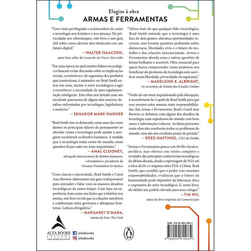 Considerações sinceras e ponderadas — do ponto de vista do presidente da Microsoft e de uma das maiores pensadoras do setor tecnológico — sobre como equilibrar a enorme promessa e o risco existencial à medida que a digitalização de tudo à nossa volta se intensifica. O presidente da Microsoft, Brad Smith, opera com base em uma simples convicção: quando sua tecnologia muda o mundo, você também é responsável por lidar com o mundo que ajudou a criar. Talvez isso pareça óbvio, mas bate de frente com um setor tecnológico obcecado pelo crescimento rápido e, às vezes, pela disrupção como um fim em si mesma. Ainda que a transformação digital esmagadora seja uma grande promessa, chegamos a um ponto de inflexão.BRAD SMITHPresidente da Microsoft que lidera uma equipe de mais de 1.400 profissionais de negócios, jurídicos e de assuntos corporativos que trabalham em 56 países. Brad desempenha um papel fundamental na liderança da empresa e em questões críticas envolvendo a confluência entre tecnologia e sociedade, incluindo cibersegurança, privacidade, inteligência artificial, direitos humanos, imigração, filantropia e sustentabilidade ambiental. The Australian Financial Review o descreveu como “uma das figuras mais respeitadas do setor tecnológico”, e o New York Times se referiu a ele como “o embaixador efetivo do setor tecnológico”. CAROL ANN BROWNEDiretora sênior de comunicações e relações exteriores da Microsoft. Carol e Brad colaboraram em uma ampla variedade de textos, vídeos e outros compromissos mundo afora, incluindo o Today in Technology.O mundo transfigurou a tecnologia da informação em uma ferramenta poderosa e em uma arma temível, e precisamos de novas abordagens para gerenciar uma era definida por invenções ainda mais poderosas, como a inteligência artificial. As empresas que criam tecnologia devem ter mais responsabilidade pelo futuro, e os governos precisarão regulamentar a tecnologia com mais rapidez, a fim de acompanhar o ritmo da inovação.Em Armas e Ferramentas, Brad Smith e Carol Ann Browne nos proporcionam uma narrativa cativante, direto do comando de uma das maiores e mais poderosas empresas de tecnologia do mundo, que se encontra no meio de algumas das questões emergentes mais espinhosas de nossa era. São desafios sem precedentes para os quais não existe manual, como privacidade; crimes cibernéticos e guerras cibernéticas; mídias sociais; as questões morais da inteligência artificial; e a relação das grandes tecnologias com a desigualdade e a democracia.Elogios à obra Armas e Ferramentas:“Uma visão privilegiada e esclarecedora de como a tecnologia nos fortalece e nos ameaça. Da privacidade aos ciberataques, este livro é um guia útil sobre como desviar dos obstáculos em um futuro digital.” — WALTER ISAACSON, autor best-seller de Leonardo da Vinci e Steve Jobs“Em uma época na qual muitos líderes tecnológicos buscam evitar discussão sobre as implicações sociais, econômicas e de segurança dos produtos que construíram, é animador ver Brad Smith entrar em cena, incitar o setor tecnológico a agir e reconhecer a necessidade de uma regulamentação inteligente. Esta obra nos brinda com um excelente panorama de alguns dos maiores desafios enfrentados por tecnólogos, legisladores e usuários.” — SENADOR MARK WARNER“Brad Smith tem se destacado como uma das vozes dentre os principais líderes de pensamento ao abordar como a tecnologia pode ajudar a assegurar ou destruir os direitos humanos. A medida que a tecnologia toma conta do mundo, essas questões ficam cada vez mais importantes.” — AMAL CLOONEY, advogada internacional de direitos humanos, cofundadora e presidente da Clooney Foundation for Justice“Com clareza e sinceridade, Brad Smith e Carol Ann Browne elaboraram um guia indispensável para entender e lidar com os maiores desafios tecnológicos de nosso tempo. Com base na experiência, bem como nas lições que a história nos ensina, este livro revela que as soluções envolvem a colaboração entre governos e ultrapassa fronteiras. Leitura obrigatória.” — MARGARET O’MARA, autora do livro The Code“Talvez mais do que qualquer líder tecnológico, Brad Smith entende que a tecnologia é uma faca de dois gumes: alavanca oportunidades incríveis, mas levanta questões profundas sobre democracia, liberdades civis e o futuro do trabalho e das relações internacionais. Armas e Ferramentas aborda essas e outras questões de forma brilhante e acessível. Obra essencial para quem busca compreender como podemos nos beneficiar da promessa da tecnologia sem sacrificar nossa liberdade, privacidade ou segurança.” — MADELEINE K. ALBRIGHT, ex-secretária de Estado dos Estados Unidos“Vindo de um setor impulsionado pela disrupção, é reconfortante ler o apelo de Brad Smith para que esse mesmo setor assuma mais responsabilidades. Em Armas e Ferramentas, Brad e Carol Ann Browne se debatem com alguns dos desafios de tecnologia mais espinhosos do mundo com bom senso e informações valiosas. As ideias presentes nesta obra não resolverão todos os problemas do mundo, mas são um excelente ponto de partida.” — REED HASTINGS, CEO da Netflix“Armas e Ferramentas parece um thriller técnico jurídico, mas oferece um relato completo e revelador das principais controvérsias tecnológicas da última década, desde a espionagem da NSA até a ética da IA e o impasse entre EUA e China. Brad Smith, que acredita que o poder traz enormes responsabilidades, evidencia que o futuro da humanidade pode depender da liderança ética e responsiva do setor tecnológico. E, neste livro, ele define um padrão elevado para seus colegas.” — TIM WU, autor do livro Impérios da Comunicação.