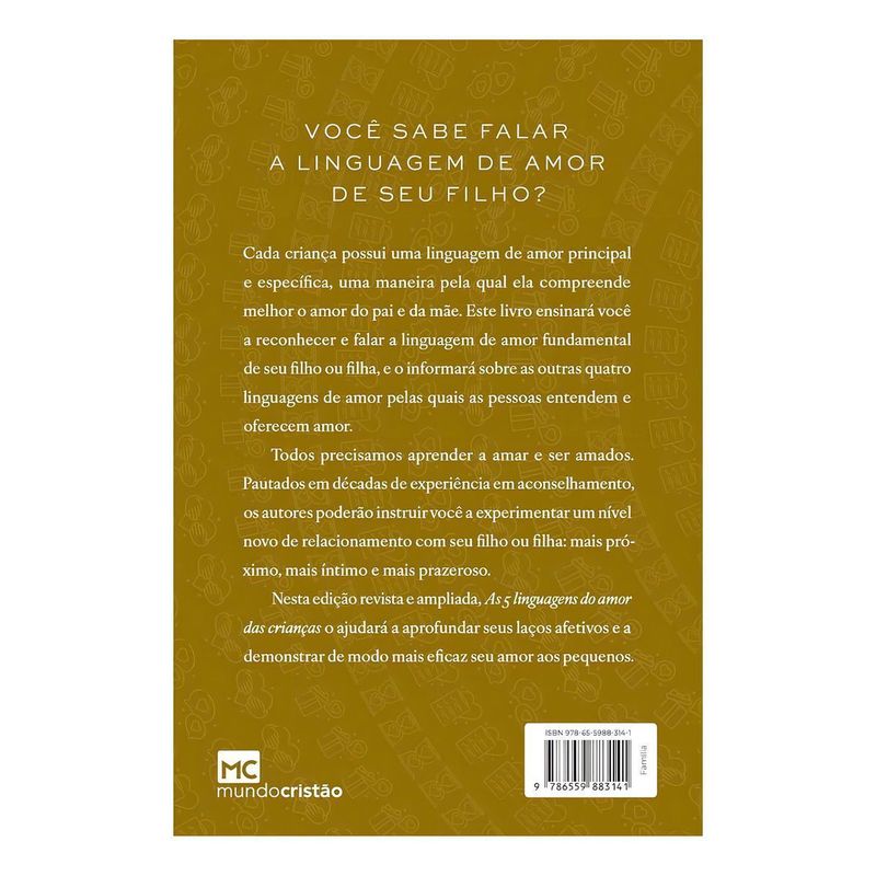 Você sabe falar a linguagem de amor de seu filho? Cada criança possui uma linguagem de amor principal e específica, uma maneira pela qual ela compreende melhor o amor do pai e da mãe. Este livro ensinará você a reconhecer e falar a linguagem de amor fundamental de seu filho ou filha, e o informará sobre as outras quatro linguagens de amor pelas quais as pessoas entendem e oferecem amor. Todos precisamos aprender a amar e ser amados. Pautados em décadas de experiência em aconselhamento, os autores poderão instruir você a experimentar um nível novo de relacionamento com seu fIlho ou filha: mais próximo, mais íntimo e mais prazeroso. Nesta edição revista e ampliada, As 5 linguagens do amor das crianças o ajudará a aprofundar seus laços afetivos e a demonstrar de modo mais eficaz seu amor aos pequenos