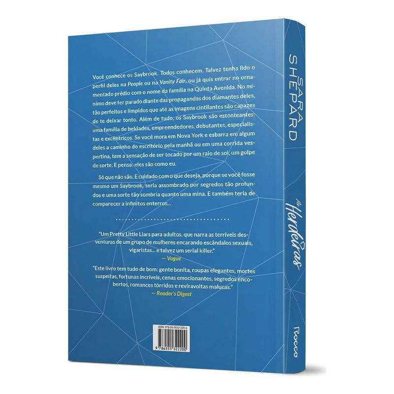 Diamantes são eternos… E a morte também A única coisa mais perfeita que um diamante da Saybrook é a família por trás do império de joias. Lindos, fabulosamente ricos e bem-sucedidos, os Saybrook são o epítome da alta sociedade. Algumas pessoas matariam para ser um deles. Literalmente. No entanto, parece que uma maldição persegue a família, que guarda segredos obscuros e é cercada por tragédias inexplicáveis. E quando, em uma bela manhã de maio, Poppy Saybrook, a mais admirável e perfeita das herdeiras e presidente da empresa, se joga da janela do escritório, todos ficam chocados. Por que alguém que tem tudo acabaria com a própria vida? Então as outras primas recebem um aviso sinistro: “Uma herdeira a menos, faltam quatro.” Foi suicídio… ou assassinato? E quem será a próxima? Aster, a garota linda e inconsequente que nunca trabalhou um dia sequer — e que está encobrindo o segredo mais sombrio de seu pai? Sua irmã mais velha, Corinne, cujo futuro meticulosamente planejado está prestes a desmoronar? Ou talvez Natasha, a rebelde da família, que se deserdou subitamente alguns anos atrás? Ou quem sabe Rowan, a solteira convicta, que mais tinha a ganhar com a morte da prima? Um thriller envolvente e emocionante sobre um grupo de mulheres que precisa descobrir a verdade sobre os segredos mais perigosos da família, antes que percam a única coisa que o dinheiro não pode comprar: suas vidas. “Um Pretty Little Liars para adultos, que narra as terríveis desventuras de um grupo de mulheres encarando escândalos sexuais, vigaristas… e talvez um serial killer.” — Vogue