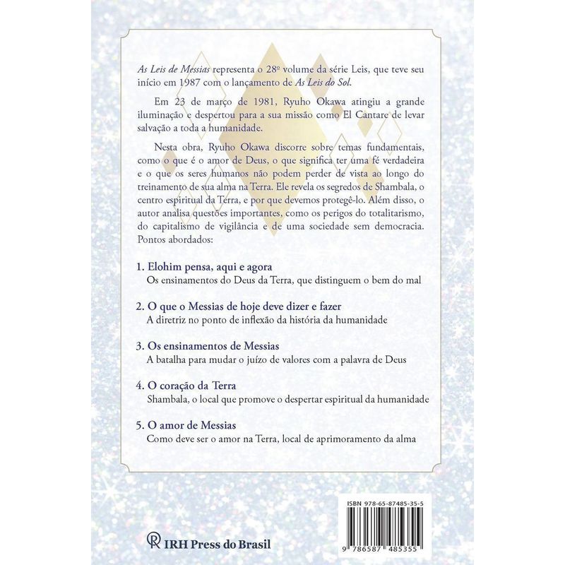 As Leis de Messias representa o 28o volume da série Leis, que teve seu início em 1987 com o lançamento de As Leis do Sol. Em 23 de março de 1981, Ryuho Okawa atingiu a grande iluminação e despertou para a sua missão como El Cantare de levar a salvação à toda humanidade. Nesta obra, Ryuho Okawa discorre sobre temas fundamentais como o que é o amor de Deus, o que significa ter uma fé verdadeira e o que os seres humanos devem resguardar a qualquer custo ao longo do seu treinamento da alma na Terra. Ele revela os segredos de Shambala, o centro espiritual da Terra, e o porquê devemos protegê-lo. O que é bem e mal sob os olhos de Deus? Por que é preciso mudar o juízo de valores atual? Qual é o perigo do totalitarismo, do regime de vigilância e de uma sociedade sem democracia?