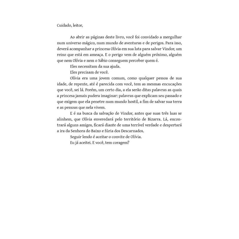 Há alguns anos, no reino de Vindor, eram três as princesas. Cada uma delas representando uma das luas. Eram princesas porque suas famílias estavam entre os primeiros fundadores do Reino. E, daquele trio de mulheres, dependia a segurança e a eternidade do Reino. Vindor era governada pelo Imperador. Homem jovem, descendente direto do Imperador Amarelo, cuja missão era governar o Reino. As três princesas eram participantes do governo, mas o poder estava nas mãos do Imperador. Sempre.