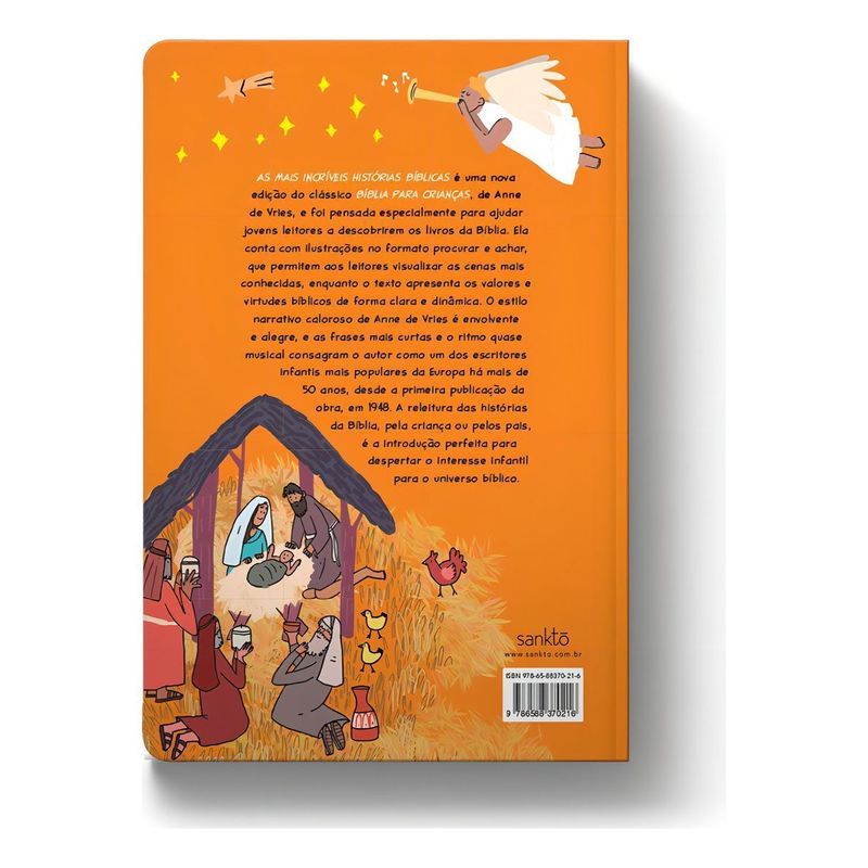 As mais incríveis histórias bíblicas é uma nova edição do clássico Bíblia para crianças, de Anne de Vries, e foi pensada especialmente para ajudar jovens leitores a descobrirem os livros da Bíblia. Ela conta com ilustrações no formato procurar e achar, que permitem aos leitores visualizar as cenas mais conhecidas, enquanto o texto apresenta os valores e virtudes bíblicos de forma clara e dinâmica. O estilo narrativo caloroso de Anne de Vries é envolvente e alegre, e as frases mais curtas e o ritmo quase musical consagram o autor como um dos escritores infantis mais populares da Europa há mais de 50 anos, desde a primeira publicação da obra, em 1948. A releitura das histórias da Bíblia, pela criança ou pelos pais, é a introdução perfeita para despertar o interesse infantil para o universo bíblico.