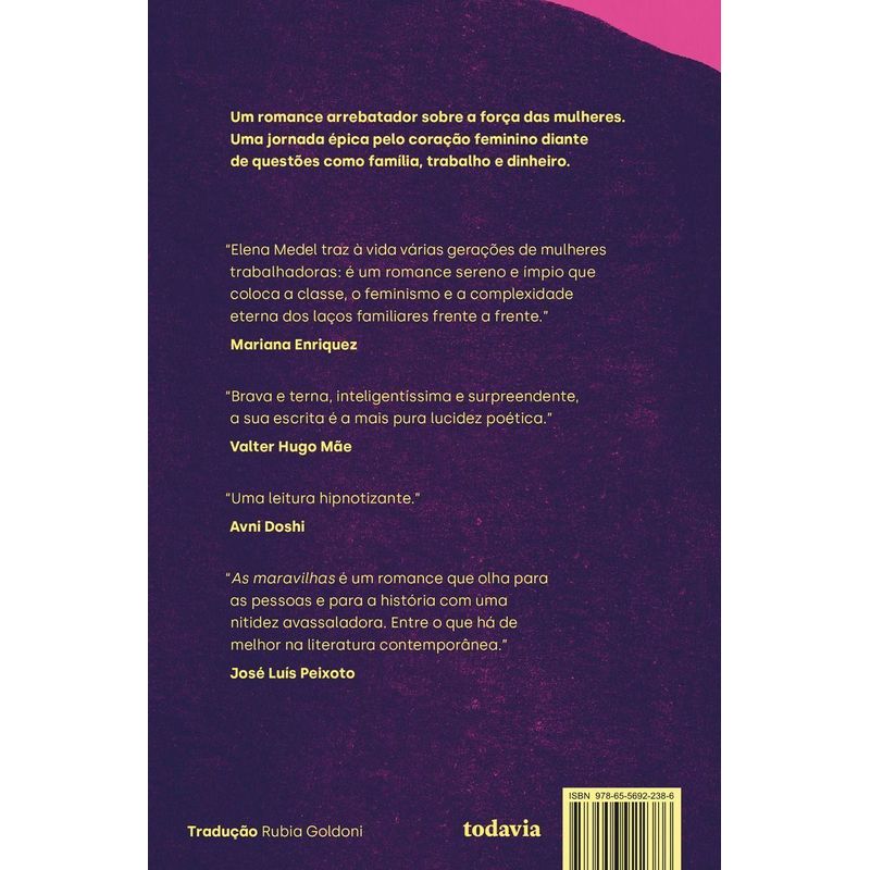 Qual o peso da família nas nossas vidas, e qual o peso do dinheiro? O que acontece quando uma mãe decide não cuidar da filha, e quando uma filha decide não cuidar da mãe? Seríamos diferentes se tivéssemos nascido em outro lugar, em outro tempo, em outro corpo? Neste celebrado romance de Elena Medel há duas mulheres: María, que no final dos anos 1960 deixa sua pacata cidade de província para trabalhar em Madri; e Alicia, que faz o mesmo caminho trinta anos mais tarde, por razões bem diferentes. E há, claro, a mulher que as une e de quem praticamente não se fala: filha de uma e mãe da outra. As maravilhas é um romance sobre o dinheiro, ou melhor, sobre como a falta de dinheiro pode determinar uma vida inteira de precariedade e matar, um a um, todos os sonhos de alguém. Uma história sobre afetos, cuidados, responsabilidades e expectativas. E, também, uma jornada sobre o passado recente da Espanha, do final da ditadura franquista até a explosão do feminismo, contada por duas mulheres que tampouco podem ir às manifestações lutar pelos seus direitos porque têm, claro, de trabalhar para garantir o seu sustento. Vencedor do Prêmio Francisco Umbral de Livro do Ano e já uma sensação na Espanha e em mais de uma dezena de países, As maravilhas traz meio século do movimento feminista à tona. Seu mergulho na vida interior das protagonistas é tão profundo e articulado quanto suas reflexões acerca do mundo do trabalho para milhões de assalariadas. O lirismo de Elena Medel revela suas raízes como poeta, mas sua narrativa — rápida e com pleno domínio da forma — mostra que ela é uma romancista cheia de bravura, dona de uma prosa hipnotizante. Este é um romance que inaugura uma nova e inimitável voz na ficção contemporânea.