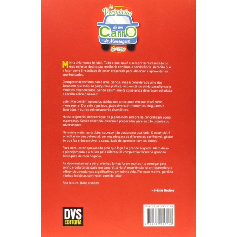 O livro As Peripécias de um Carro de Mensagens ao Vivo – o empreendedorismo abordado de forma inovadora (DVS Editora), de Ivânia Backes, narra uma jornada empreendedora real, com todos os seus sucessos e percalços. A autora expõe, de modo divertido e emocionante, os episódios que marcaram os cinco anos em que esteve à frente do negócio de mensagens ao vivo – e oferece dicas valiosas a quem deseja empreender. Com estilo leve e fluido, Ivânia Backes – empresária, consultora, instrutora do Sebrae e professora de pós-graduação – conta sua história em primeira pessoa, conduzindo o leitor a se imaginar na pele de uma empreendedora que decidiu iniciar um novo negócio, desde a concepção até o momento de encerrar as atividades. Tudo começa quando a autora e protagonista percebe que transmitir emoções poderia ser uma oportunidade de negócios. A partir daí, o que vemos é uma mulher obstinada a concretizar seus objetivos. A persistência de Ivânia gera empatia imediata, o que nos faz vibrar com ela quando o carro passa a rodar pelas ruas de Quintão, pequeno distrito litorâneo localizado a 120 km de Porto Alegre. Também ficamos tensos quando ela precisa sair de alguma saia justa. E nesse sentido, as atitudes da autora em cada situação adversa é uma aula de desenvoltura, maleabilidade e jogo de cintura, características tão essenciais para empreendedores – e para qualquer um que precise lidar com os problemas do dia a dia. Além de todo o aprendizado transmitido pelas histórias do livro, ao final da obra, há um material extra voltado para quem possui ou deseja abrir um negócio. Aqui você encontra o que precisa saber para não passar pelo que passei. – escreve Ivânia. São páginas elaboradas a partir das experiências e dos estudos realizados pela autora.