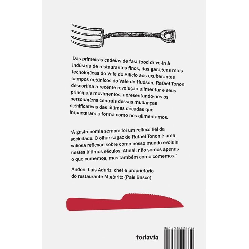 Das primeiras cadeias de fast-food drive-in à indústria de restaurantes finos, das garagens tecnológicas do Vale do Silício aos campos orgânicos do Vale do Hudson, o autor descortina a recente revolução alimentar e seus movimentos, apresentando os personagens centrais dessas mudanças que impactaram a forma como nos alimentamos. Uma reportagem envolvente que combina as aventuras de Anthony Bourdain com as habilidades de Malcolm Gladwell.
