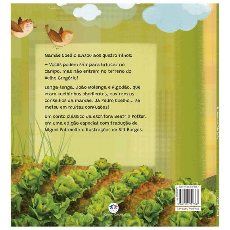 Mamãe Coelho avisou aos quatro filhos: Vocês podem sair para brincar no campo, mas não entrem no terreno do Velho Gregório! Lenga-lenga, João Molenga e Algodão, que eram coelhinhos obedientes, ouviram os conselhos da mamãe. Já Pedro Coelho… se meteu em muitas confusões! Um conto clássico da escritora Beatrix Potter, nesta edição especial com tradução de Miguel Falabella e ilustrações de Bill Borges.