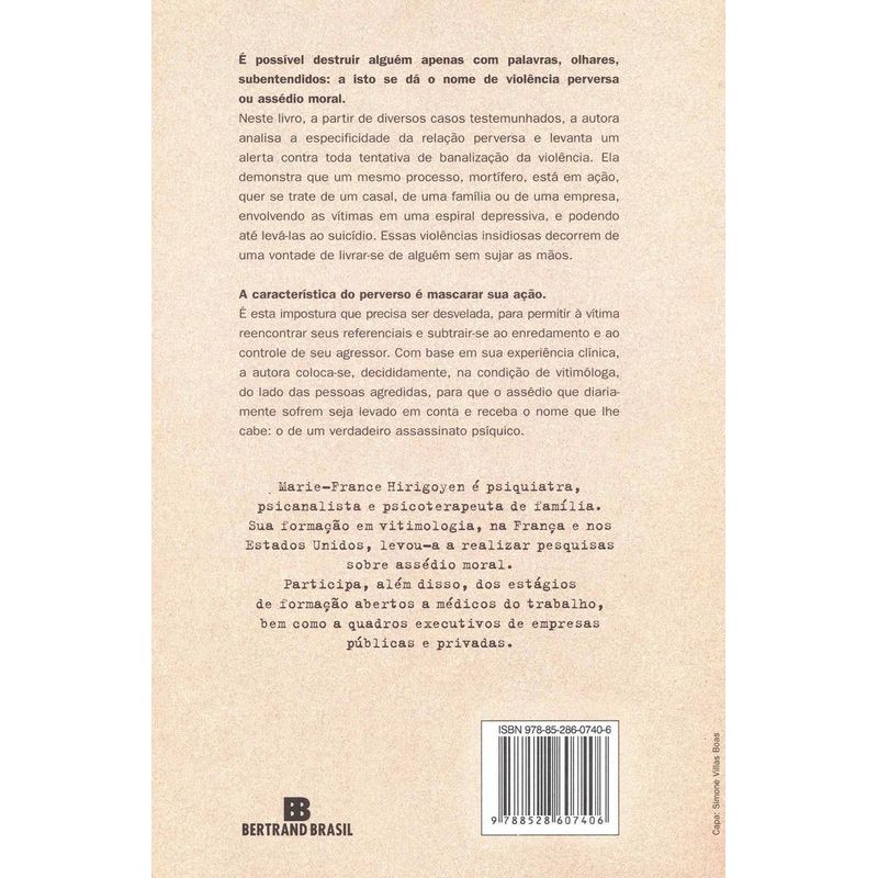 Podemos destruir alguém apenas com palavras e olhares subentendidos? Sim. A isto damos o nome de violência perversa ou assédio moral. De forma a analisar passo a passo como essa violência insidiosa se processa por palavras, gestos, ações ou omissões, a autora levanta também um alerta contra toda tentativa de banalização da violência. Assédio Moral – A violência perversa no cotidiano descreve detalhadamente o processo que se instaura e se desenvolve nos mais diversos grupos e locais: na relação casal ou interpessoal, as formas pelas quais um vai enredando, desestabilizando o outro e assumindo o domínio e o controle; na família, onde com um “é para o seu bem”, crianças vão sendo anuladas e despossuídas de tudo que é mais vivo e vital; nas empresas, públicas ou privadas, em que o chamado assédio sexual, hoje tão enfocado na mídia, é apenas uma das formas pelas quais um empregado é tornado joguete de mecanismos perversos que a cinicamente rotulada “flexibilização” do trabalho exacerbou e o fantasma do desemprego hoje alimenta. A obra em questão interessa aos que trabalham na área psi, médicos do trabalho, dirigentes, em qualquer nível, das empresas, ao profissional que trabalha em qualquer setor de relações humanas no trabalho e na família, a todo aquele que se interessa por ver extinto em nossa sociedade tudo que hoje a violenta e des-humaniza. A AUTORA Marie-France Hirigoyen é psiquiatra, psicanalista e psicoterapeuta de família. Sua formação em vitimologia, na França e nos Estados Unidos, levou-a a realizar pesquisas sobre assédio moral. Participa, além disso, dos estágios de formação abertos a médicos do trabalho, bem como a quadros executivos de empresas públicas e privadas.