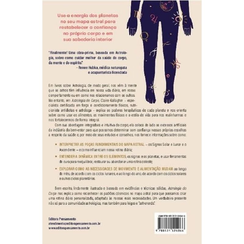 E se os astros pudessem guiar sua saúde e bem-estar? Astrologia do Corpo revela como seu mapa astral influencia sua rotina, metabolismo e necessidades físicas. A nutricionista, treinadora e astróloga Claire Gallagher ensina a interpretar os signos solar, lunar e ascendente para criar uma abordagem personalizada de alimentação, movimento e autocuidado.