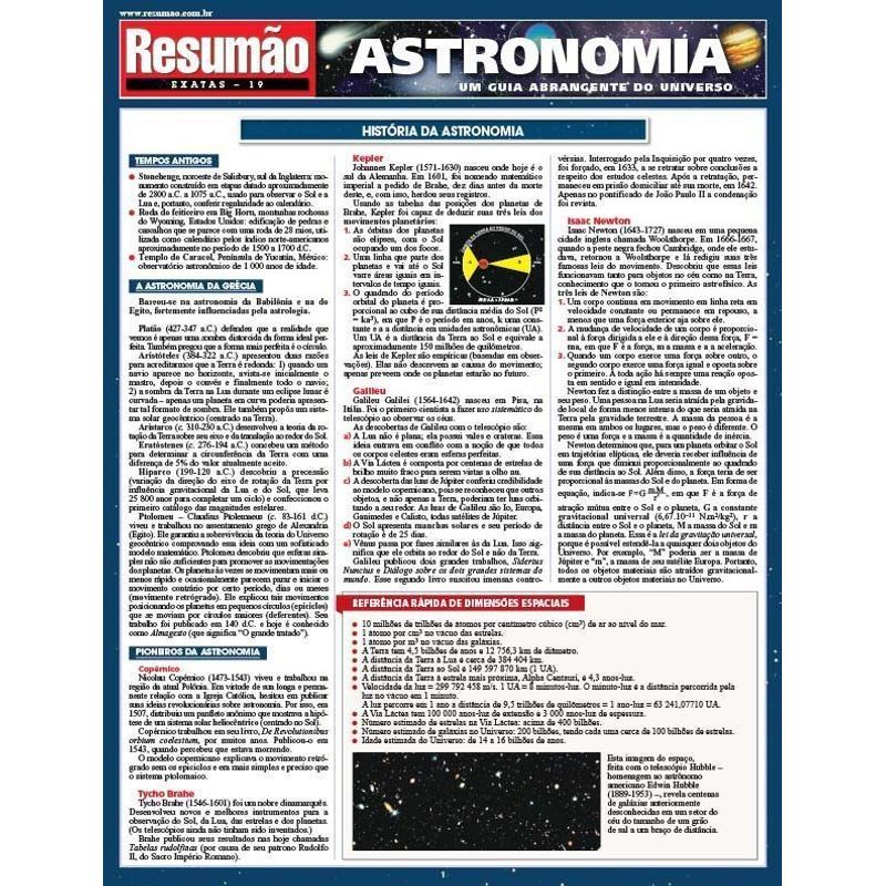 Um guia abrangente do universo. História da astronomia: tempos antigos; a astronomia da Grécia e os pioneiros da astronomia (Copérnico, Tycho Brahe, Kepler, Galileu, Newton). O sistema solar. Os planetas terrestres/telúricos (Terra, Mercúrio, Vênus, Marte). Os planetas jovianos e Plutão (Urano, Júpiter, Saturno, Netuno). O sol. As estrelas (propriedades das estrelas, luz das estrelas). Galáxias. Conceitos de cosmologia. E mais: quadros com referência rápida de dimensões espaciais; dados comparativos dos planetas terrestres; dados comparativos dos planetas jovianos e Plutão; relação de satélites de planetas.