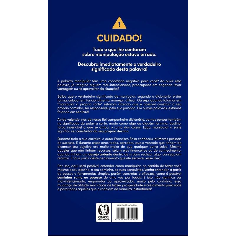 A palavra manipular tem uma conotação negativa para você? Ao ouvir esta palavra, já imagina alguém mal-intencionado, preocupado em enganar, levar vantagem ou se aproveitar da situação? Saiba que o verdadeiro significado de manipular, segundo o dicionário, é dar forma, colocar em funcionamento, manejar, utilizar. Ou seja, quando falamos em “manipular a própria sorte” estamos dizendo que é possível construir o seu próprio caminho, ser responsável pela sua jornada. Em outras palavras, estamos falando em ser livre! Ainda valendo-nos de nosso fiel companheiro dicionário, vamos pensar também no significado da palavra sorte: modo como algo ou alguém termina, destino, força invencível a que se atribui o rumo das coisas. Logo, manipular a sorte significa ser construtor do seu próprio destino. Durante toda a sua carreira, o autor Francisco Sosa conheceu inúmeras pessoas de sucesso. E durante esses anos todos, percebeu que a vontade que tinham de alcançar seu objetivo era muito maior do que qualquer outra coisa. Mesmo aqueles que não tinham recursos, sejam eles financeiros ou de conhecimento, quando tinham um desejo ardente dentro de si para realizar algo, conseguiam realizar. E foi a partir deste pensamento que ele escreveu esse livro. Por isso, aqui será possível entender como manipular, no sentido de fazer você mesmo o seu destino, o seu caminho, as suas conquistas. Venha entender, a partir de passos e ferramentas simples, porém concretas e eficazes, como é possível caminhar rumo ao sucesso de uma vez por todas!