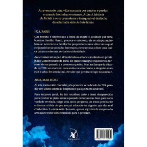 Atravessando uma vida marcada por amores e perdas, cruzando fronteiras e oceanos, Atlas: A história de Pa Salt, escrito por Lucinda Riley e seu filho Harry Whittaker, é o surpreendente e inesquecível desfecho da aclamada série As Sete Irmãs. 1928, Paris Um menino é encontrado à beira da morte e acolhido por uma bondosa família. Gentil, precoce e talentoso, ele se adapta muito bem ao novo lar, e a família lhe proporciona uma vida com a qual ele jamais havia sonhado. Entretanto, ele se recusa a dizer uma única palavra sobre sua verdadeira identidade. Ao se tornar um rapaz, descobrindo o amor e estudando no prestigiado Conservatório de Paris, ele quase consegue esquecer os horrores de seu passado e a promessa que fez. Mas, na Europa da década de 1930, um mal vem crescendo e se alastrando, e ninguém mais está a salvo. Em seu íntimo, ele sabe que precisará fugir novamente. 2008, mar Egeu As sete irmãs estão reunidas, pela primeira vez, a bordo do Titã para dar um último adeus ao enigmático pai que tanto amavam. Para surpresa geral, Pa Salt havia escolhido justo a irmã desaparecida para receber as pistas sobre o passado de todas elas. Mas, para cada verdade revelada, surge uma nova pergunta. As irmãs precisarão enfrentar a ideia de que seu pai adorado era alguém que elas mal conheciam. E, ainda mais chocante, que os segredos de seu passado ameaçam trazer consequências para o presente.