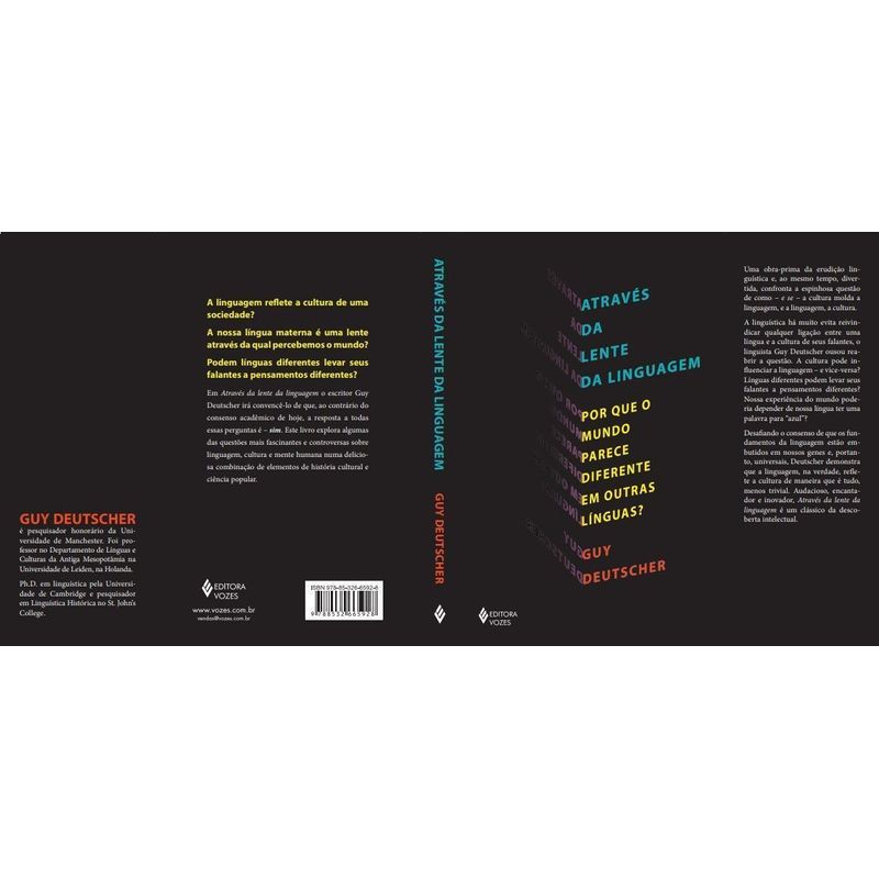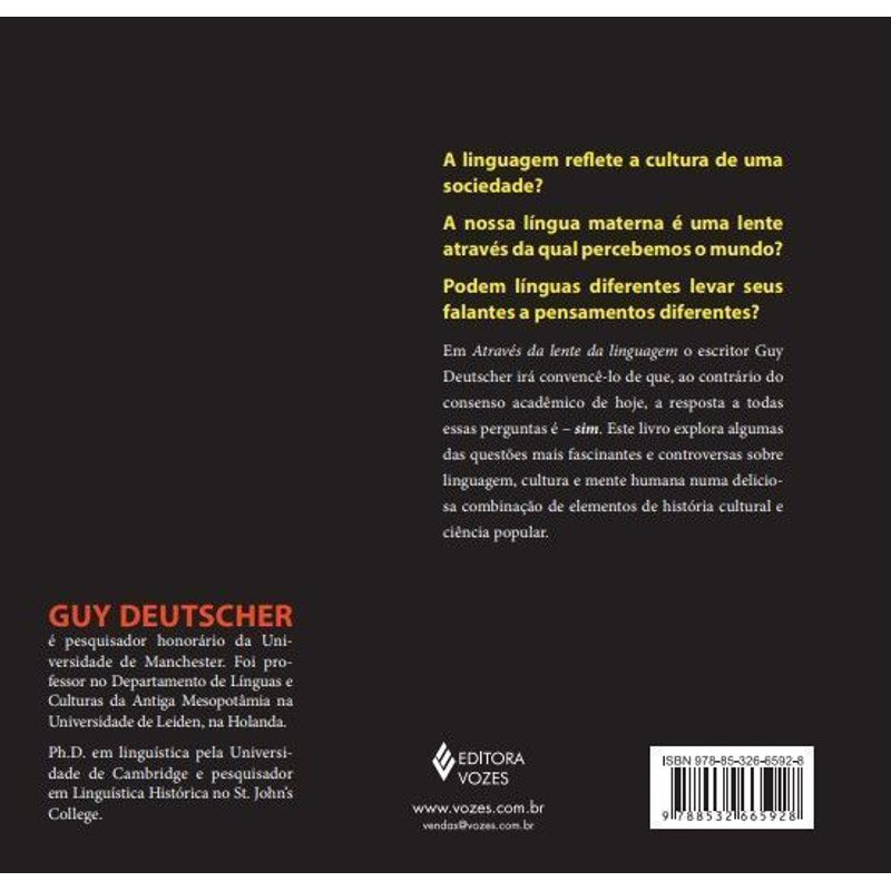 Uma obra-prima da erudição linguística e, ao mesmo tempo, divertida, confronta a espinhosa questão de como – e se – a cultura molda a linguagem, e a linguagem, a cultura. A linguística há muito evita reivindicar qualquer ligação entre uma língua e a cultura de seus falantes, o linguista Guy Deutscher ousou reabrir a questão. A cultura pode influenciar a linguagem – e vice-versa? Línguas diferentes podem levar seus falantes a pensamentos diferentes? Nossa experiência do mundo poderia depender de nossa língua ter uma palavra para “azul”? Desafiando o consenso de que os fundamentos da linguagem estão embutidos em nossos genes e, portanto, universais, Deutscher demonstra que a linguagem, na verdade, reflete a cultura de maneira que é tudo, menos trivial. Audacioso, encantador e inovador, Através da lente da linguagem é um clássico da descoberta intelectual.