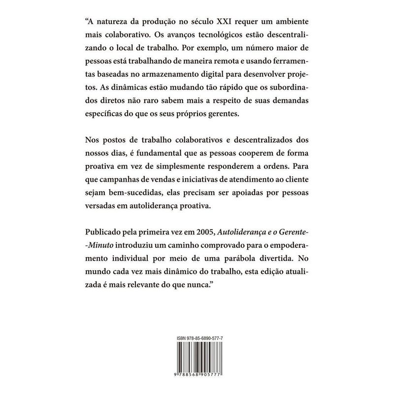 Em nova edição revista e atualizada, Autoliderança e o Gerente-Minuto ensina que assumir a responsabilidade do próprio sucesso leva ao empoderamento, à liberdade e à autonomia. Assim como o clássico best-seller O novo Gerente-Minuto oferece aos líderes os três segredos da gestão de pessoas, este Autoliderança e o Gerente-Minuto apresenta os três segredos da autoliderança: contestar restrições autoimpostas, ativar seu ponto de poder e ser proativo. Revela, também, que assumir a responsabilidade do seu próprio sucesso leva ao empoderamento, à liberdade e à autonomia uma cativante parábola de negócios, Ken Blanchard, PhD pela Universidade de Cornell e um dos mais influentes especialistas em liderança do mundo, Susan Fowler, uma das maiores especialistas em empoderamento pessoal, e Laurence Hawkins, consultor gerencial de renome internacional e palestrante motivacional, mostram como aplicar o mundialmente famoso modelo SLII® ao desenvolvimento pessoal. A história gira em torno de Steve, um jovem executivo de publicidade que está prestes a perder o emprego. Por meio de uma série de conversas com uma pupila do Gerente-Minuto chamada Cayla, Steve aprende os três segredos da autoliderança. As habilidades que então descobre não apenas o empoderam e possibilitam que ele mantenha o emprego, como também lhe mostram como se livrar da mentalidade de vítima e continuar crescendo, aprendendo e tendo sucesso.Há décadas, milhões de CEOs da lista Fortune 500, publicada pela revista Fortune, e de pequenas empresas ao redor do mundo seguem os métodos de gestão de Ken Blanchard para aumentar a produtividade, a satisfação no emprego e a prosperidade pessoal. Agora, esta edição revista e atualizada de Autoliderança e o Gerente-Minuto capacita pessoas em todos os níveis organizacionais, guiando-as pelo caminho do sucesso. “A natureza da produção no século XXI requer um ambiente mais colaborativo. Os avanços tecnológicos estão descentralizando o local de trabalho. Por exemplo, um número maior de pessoas está trabalhando de maneira remota e usando ferramentas baseadas no armazenamento digital para desenvolver projetos. As dinâmicas estão mudando tão rápido que os subordinados diretos não raro sabem mais a respeito de suas demandas específicas do que os seus próprios gerentes.Nos postos de trabalho colaborativos e descentralizados dos nossos dias, é fundamental que as pessoas cooperem de forma proativa em vez de simplesmente responderem a ordens. Para que campanhas de vendas e iniciativas de atendimento ao cliente sejam bem-sucedidas, elas precisam ser apoiadas por pessoas versadas em autoliderança proativa.Publicado pela primeira vez em 2005, Autoliderança e o Gerente-Minuto introduziu um caminho comprovado para o empoderamento individual por meio de uma parábola divertida. No mundo cada vez mais dinâmico do trabalho, esta edição atualizada é mais relevante do que nunca.”