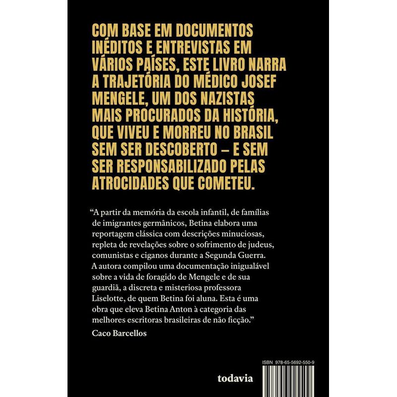 Este livro da jornalista Betina Anton conta essa história tão necessária de maneira brilhante. A partir de sua experiência pessoal, Betina faz um minucioso trabalho de recuperação de memórias e de testemunhos, com entrevistas inéditas e propondo versões dos fatos até então desconhecidas. Ao reunir pontos de vista que vão desde um comandante do Mossad a pessoas que conviveram com Mengele no Brasil, a jornalista cria um quadro sobre a vida e a morte do nazista em nosso país. Analisando a sociabilidade de Mengele em sua Baviera Tropical, Betina Anton apresenta a pergunta que permeia a obra: “Como isso foi possível?”. Como foi possível que um dos nazistas mais procurados do mundo tenha vivido sem ser perturbado por tantos anos no país e tenha sido julgado apenas pelas águas do mar de Bertioga? Esse questionamento fundamental é também um desafio e uma contribuição. A partir dele, a autora nos ajuda a pensar o Brasil e a entender não apenas Mengele, mas também os destinos e as estradas que temos escolhido para nós mesmos. Um livro imperdível. – Michel Gherman