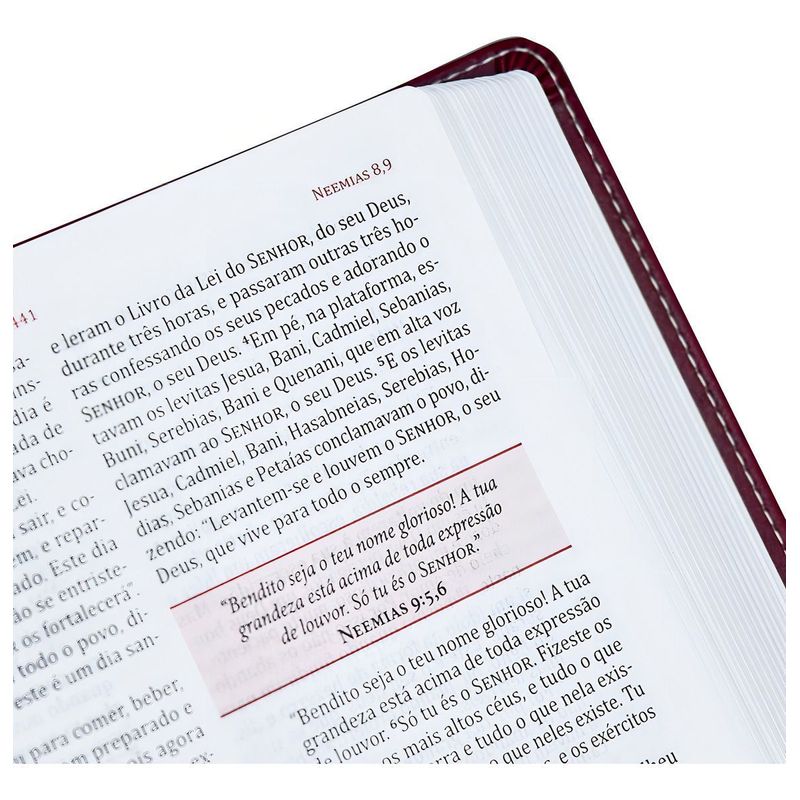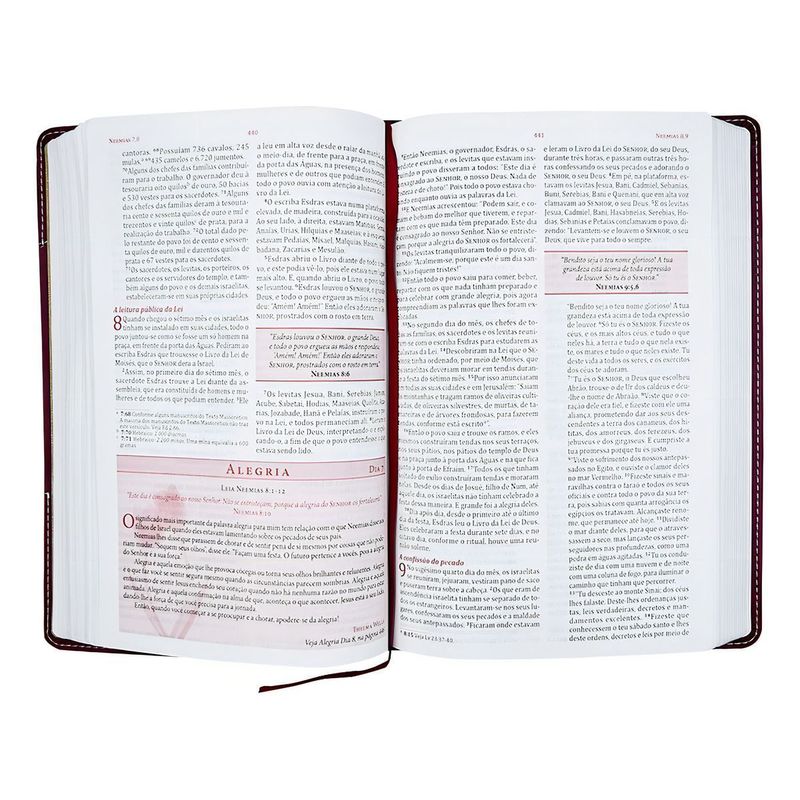 Cultivando a fé diariamente com palavras de sabedoria. A Bíblia da mulher de fé oferece inspiração e recursos especiais para leitoras em busca de uma comunhão diária com Deus e sua Palavra. Além do texto das Escrituras Sagradas, são 366 devocionais com lições e conselhos valiosos. Nela, você encontrará estudos e notas de autoras mundialmente conhecidas, como Sheila Walsh, MaryGraham e Luci Swindoll. Além de contar com um projeto gráfico em duas cores que facilita a identificação de pontos importantes, ela traz uma edição de luxo em courosoft com costura perimetral que agrega beleza e elegância a essa bíblia.