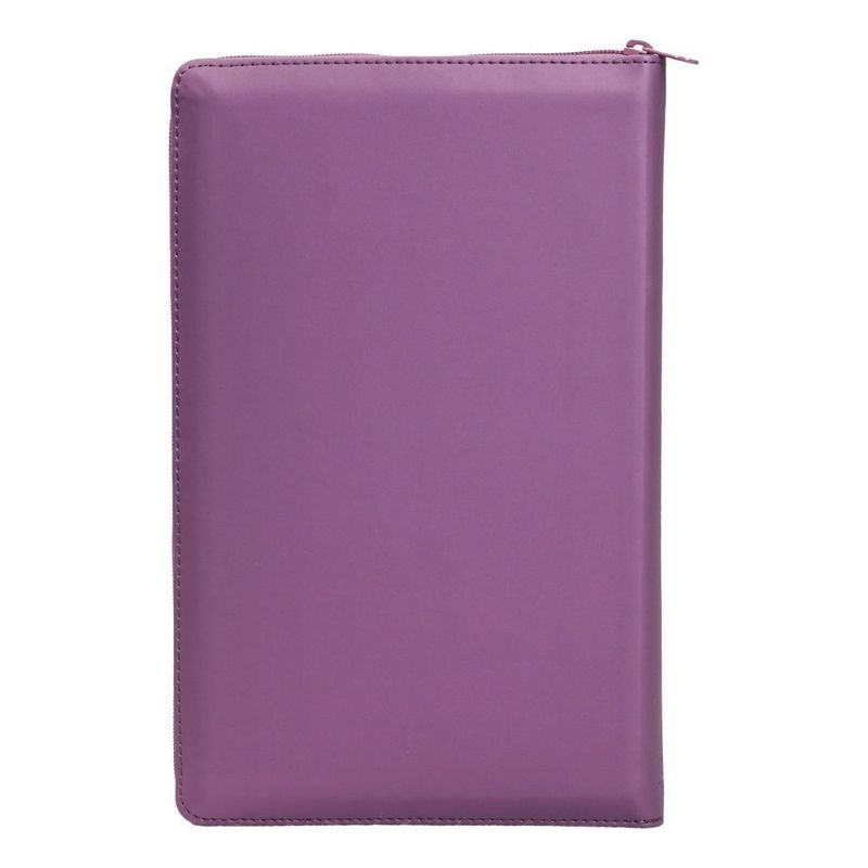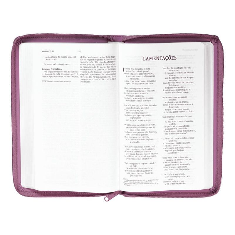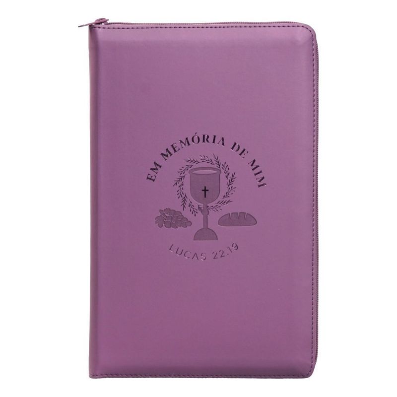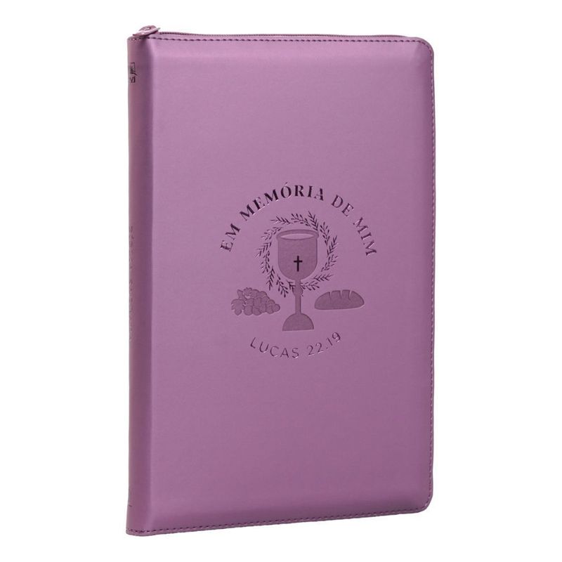 Parte da coleção de Bíblias A promessa, a capa Em memória de mim retoma a Santa Ceia. O cálice e o pão são partes centrais da última refeição de Jesus com seus apóstolos. Jesus nos ensina que o pão representa seu corpo, o qual comemos sua memória e que o cálice representa a nova aliança criada por seu sangue derramado na cruz. Conta com uma capa em couro soft roxo, desenho em baixo relevo e um toque especial em hot stamp. Seu grande diferencial é o fechamento em zíper, que traz conforto e praticidade para levá-la a qualquer lugar, seja na igreja ou para carregar na bolsa no dia a dia. Além disso, seu texto está na versão NVI (Nova Versão Internacional), que se baseia na precisão, clareza e uma abordagem contemporânea e, ao mesmo, fiel ao texto original. Nela, você encontrará ainda a fonte Leitura Perfeita. Desenvolvida exclusivamente para a Thomas Nelson Brasil, a Leitura Perfeita é uma fonte singular, moderna, bonita, clara e legível, ao mesmo tempo em que integra os melhores avanços em tipografia de bíblias modernas. O resultado é uma tipologia que traz total conforto na leitura em qualquer tamanho Adquira a Bíblia Em memória de mim e tenha a palavra de Deus contigo todos os dias! Características Texto na tradução NVI (Nova Versão Internacional) Capa em couro soft Fonte leitura perfeita Hot Stamp Acabamento lateral em zíper