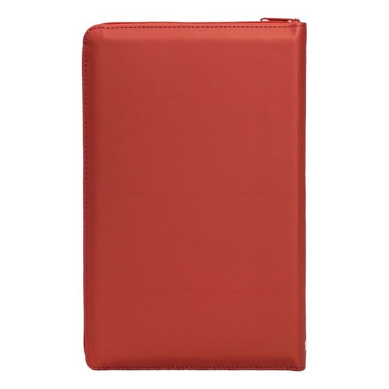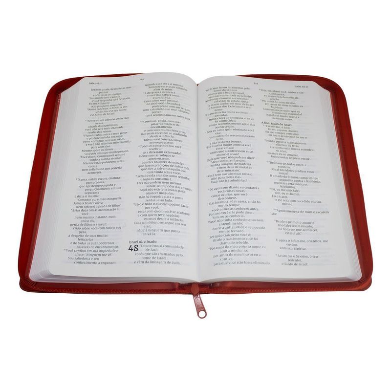 Parte da coleção de Bíblias A promessa, a capa Está consumado apresenta dois dos símbolos mais importantes do cristianismo: a cruz onde Cristo se entregou em nosso lugar e a coroa que representa sua majestade. Conta com uma capa em couro soft vermelho, desenho em baixo relevo e um toque especial em hot stamp. Seu grande diferencial é o fechamento em zíper, que traz conforto e praticidade para levá-la a qualquer lugar, seja na igreja ou para carregar na bolsa no dia a dia. Além disso, seu texto está na versão NVI (Nova Versão Internacional), que se baseia na precisão, clareza e uma abordagem contemporânea e, ao mesmo, fiel ao texto original. Nela, você encontrará ainda a fonte Leitura Perfeita. Desenvolvida exclusivamente para a Thomas Nelson Brasil, a Leitura Perfeita é uma fonte singular, moderna, bonita, clara e legível, ao mesmo tempo em que integra os melhores avanços em tipografia de bíblias modernas. O resultado é uma tipologia que traz total conforto na leitura em qualquer tamanho Adquira a Bíblia Está consumado e tenha a palavra de Deus contigo todos os dias! Características Texto na tradução NVI (Nova Versão Internacional) Capa em couro soft Fonte leitura perfeita Hot Stamp Acabamento lateral em zíper