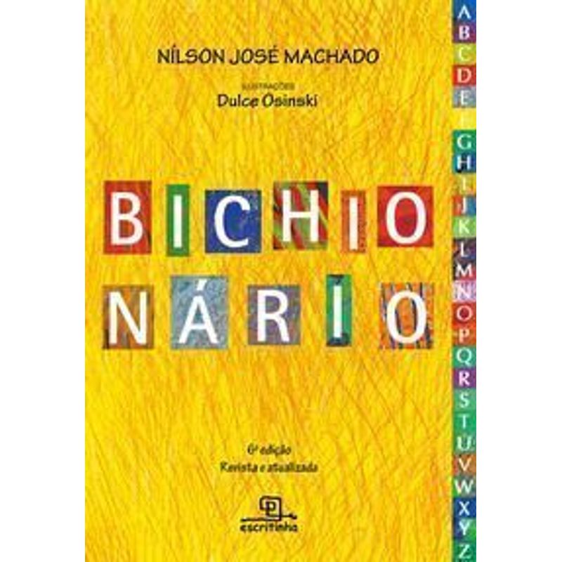 Elefante namorador, girafa que usa gravata, hipopótamo poeta e morcego de óculos escuros são alguns dos divertidos e estranhos animais que desfilam junto ao abecedário, nesta edição revista e atualizada com a inserção das letras K, W e Y. Bichionário é um convite para que leitores iniciantes explorem o alfabeto, a partir do jogo das palavras e da brincadeira com as rimas. Sobre o autor Nílson José Machado nasceu em Olinda/PE, mas vive em São Paulo/SP desde os 16 anos. Com vocação e alegria, é professor em tempo integral e escritor nas horas vagas. Lecionou Matemática em todos os níveis de ensino, inclusive no Instituto de Matemática e Estatística da Universidade de São Paulo (IME-USP), entre 1972 e 1981. Desde 1984, leciona na Faculdade de Educação da mesma universidade (FE-USP), em cursos de formação de professores. Escreveu vários livros, frutos de seu trabalho acadêmico, e alguns paradidáticos para crianças a partir de 5 anos. Sobre a ilustradora Dulce Osinski nasceu em Irati/PR em 1962, mas vive hoje em Curitiba. É artista plástica e ilustradora formada pela Escola de Música e Belas-Artes do Paraná, tendo estudado na Academia de Belas-Artes de Cracóvia, na Polônia. Doutora em Educação pela Universidade Federal do Paraná (UFPR), ilustrou diversos livros de literatura infantil e também expôs seus trabalhos em galerias e museus no Brasil e em outros países, destacando-se as mostras realizadas na Bolívia, Alemanha, Estados Unidos, Polônia, Japão, Portugal, Uruguai, Suécia, França e Eslovênia. Leia também Hipo pode nadar, texto e ilustrações de Pablo Bernasconi; O zoo de Joaquim, texto e ilustrações de Pablo Bernasconi; Tem planta que virou bicho! Volumes 1, 2 e 3, textos de Alda de Miranda, fotografias de Cacio Murilo; Haicontinhos de fadas, texto de Adson Vasconcelos, ilustrações de Gusta Vicentini.