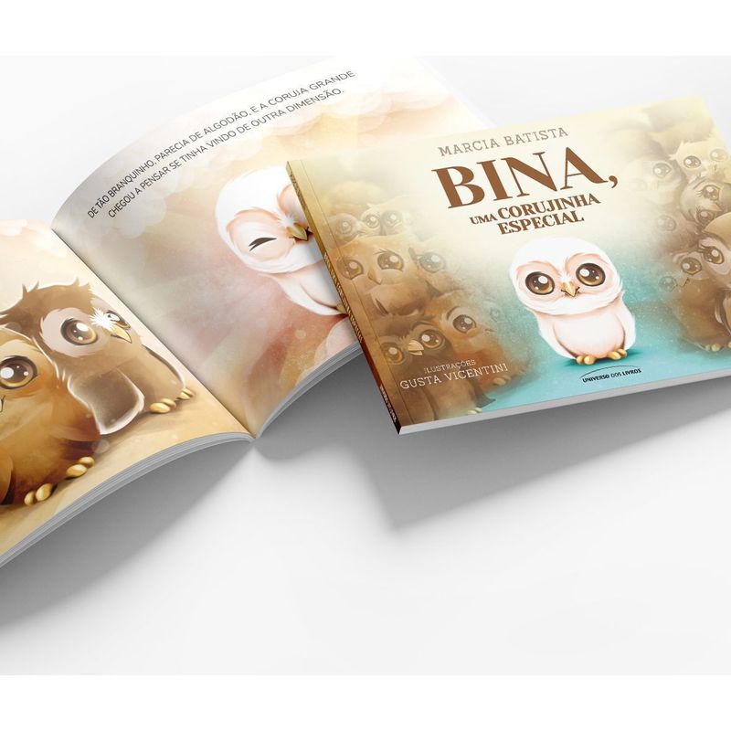 Bina, uma corujinha especial narra a vida de Bina, uma corujinha que nasceu com uma cor diferente das demais. Além disso, Bina enfrenta dificuldades de locomoção, tropeçando frequentemente e demonstrando problemas de visão. A Coruja Grande, aflita com a situação, se pergunta o que pode fazer para ajudar sua querida corujinha. Ao longo das páginas deste livro, os leitores serão convidados a acompanhar a jornada de Bina em busca de aceitação e superação. A história tem como inspiração a coruja-buraqueira — que tem hábitos diurnos e noturnos, e pode ser encontrada em quase todo o território brasileiro — e aborda temas como a diversidade, a inclusão e o amor incondicional, mostrando que cada um de nós tem um lugar especial no mundo, independentemente de nossas diferenças. Sobre a autora Marcia Batista trabalha dia após dia para empreender sonhos, e a vida determinou que seu caminho seriam os livros. Natural da capital do Estado de São Paulo, desde que aprendeu a ler entendeu que deveria se dedicar a tecer histórias. Formada em Letras pela Universidade de São Paulo (USP), é editora de livros há mais de vinte anos e mãe de duas crianças adoráveis, Edgar e Vitória. Por meio da literatura, busca semear ideias, a fim de fazê-las crescer e florescer para construir um mundo melhor. Sobre o ilustrador Gusta Vicentini nasceu em São Paulo, capital, e atualmente mora em Campinas/SP. Formou-se em Design e trabalha com artes visuais e pinturas em ambientes e telas. Iniciou sua carreira como ilustrador inspirado pelos contos dos irmãos Grimm e de Hans Christian Andersen. Com um estilo que mistura elementos lúdicos, pop e surreais, Gusta utiliza diversas técnicas para criar ilustrações ricas em cores, efeitos, luzes e sombras, transportando crianças e leitores para mundos mágicos. Leia também Hipo pode nadar, texto e ilustrações de Pablo Bernasconi O zoo de Joaquim, texto e ilustrações de Pablo Bernasconi Bichionário, textos de Nilson José Machado e ilustrações de Dulce Osinski Tem planta que virou bicho – volume 3, textos de Alda de Miranda e imagens de Cacio Murilo Euzébia zanza, textos de Camila Fillinger e ilustrações de Suppa Euclides, o menino azul, textos de Camila Fillinger e ilustrações de Paulo Tripitelli Pedro e o peixe BBB, textos de Raimundo Gadelha e ilustrações de Bruno Gomes