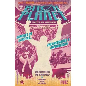 “Você é fora do padrão? Você se encaixa nos moldes? Você é gorda demais, magra demais, barulhenta demais, tímida demais, religiosa demais, antiquada demais, puritana demais, sensual demais, queer demais, negra demais, amarela demais, qualquer-coisa-que-você-é-e-será-julgada demais? Então você deve pertencer ao… PLANETA DAS VAGABUNDAS! Num futuro, apenas alguns anos à frente, na direção errada, o fracasso de uma mulher em obedecer aos seus senhores patriarcais resultará em um exílio no planeta penal mais cruel da galáxia. Quando a mais nova safra de mulheres chegar, elas poderão trabalhar juntas para permanecerem vivas ou será que agendas ocultas, guardas desonestos e o esporte mais mortal dentro (ou fora!) da Terra as levarão ao seu criador? A premiada autora Kelly Sue DeConnick e Valentine De Landro se uniram à colorista brasileira Cris Peter para criar o volume de estreia de Bitch Planet – Planeta das Vagabundas, uma ficção científica deliciosamente cruel e real sobre o patriarcado. Completo em 3 volumes.”