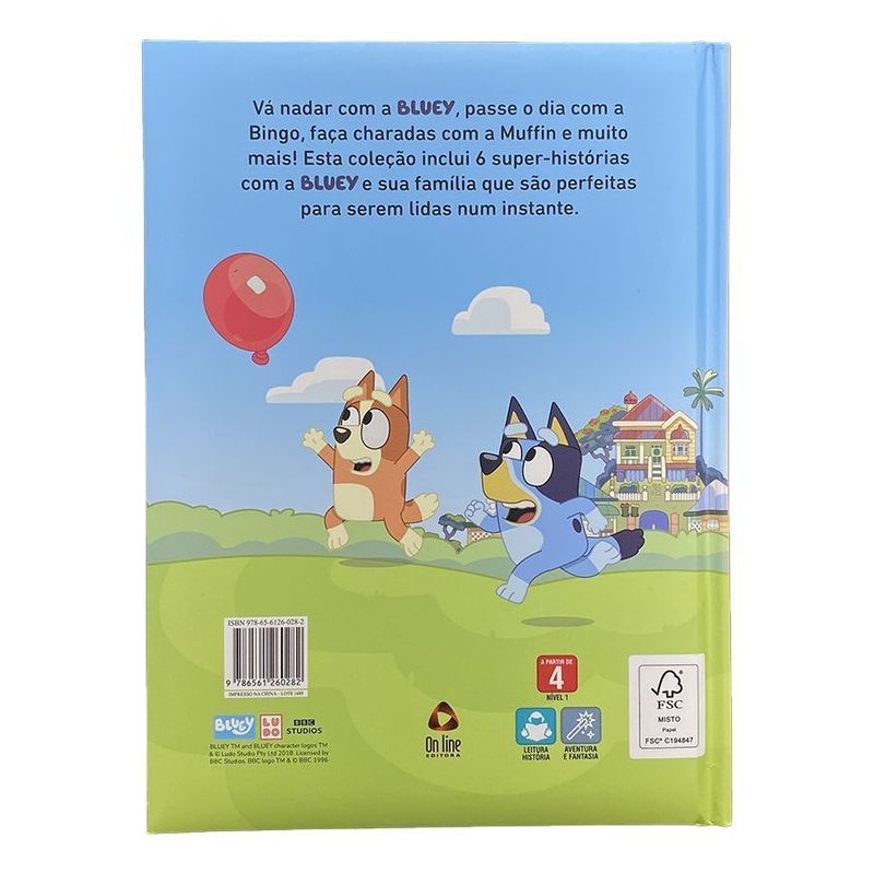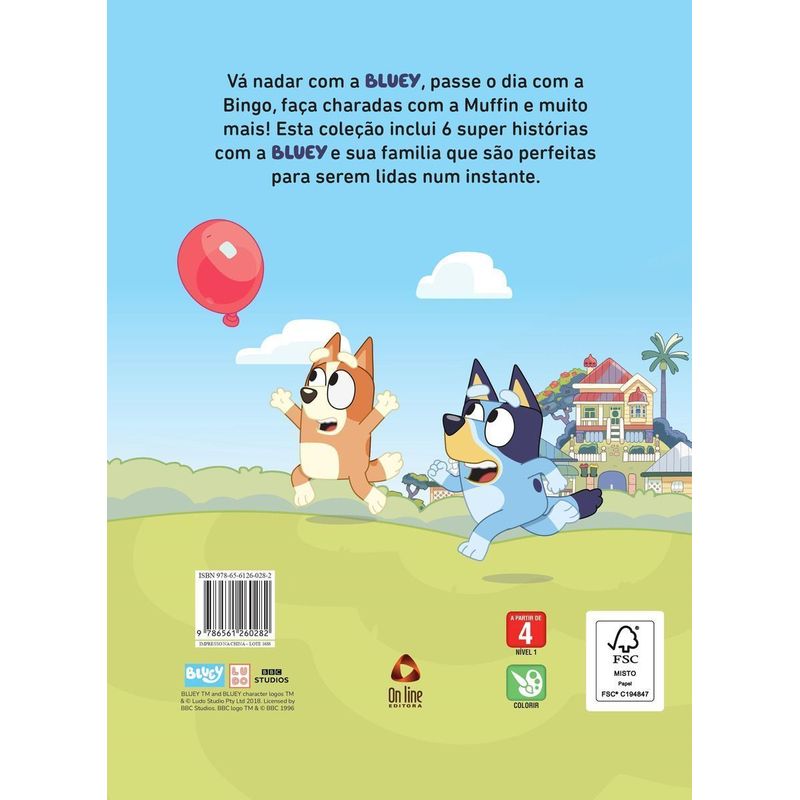 Mergulhe em um dia cheio de diversão com Bluey e sua família! Nade com Bluey, passe o dia com Bingo, resolva charadas com Muffin e muito mais! Esta coleção apresenta 6 histórias encantadoras com Bluey e seus amigos, ideais para leituras rápidas e cheias de aventura. Cada história é perfeita para criar momentos especiais e divertidos com a família.