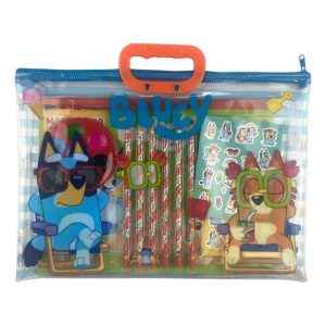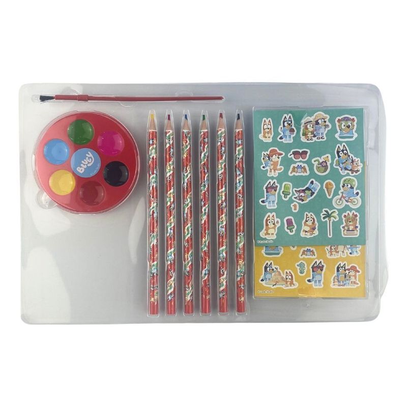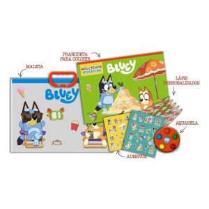 Descubra a diversão com a Maleta Divertida da Bluey! Dentro dela, você vai encontrar 6 lápis de cor grandes e uma aquarela com 5 cores super legais para pintar à vontade. E tem mais! Adesivos especiais para deixar suas criações únicas e cheias de aventuras. Com a Maleta Divertida da Bluey, a diversão é garantida por horas e horas!