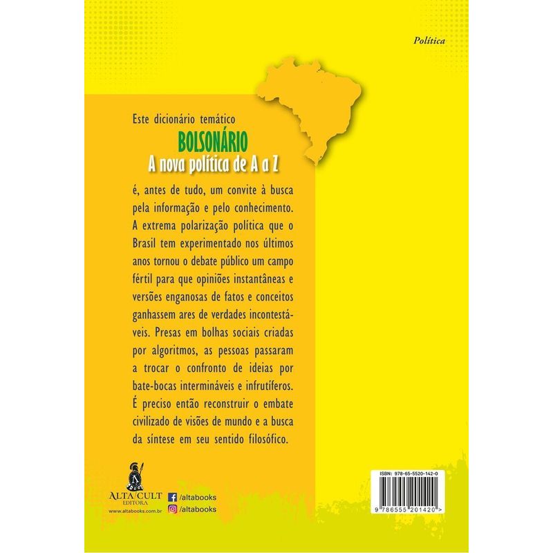 Este dicionário temático BOLSONÁRIO A nova política de A a Z é, antes de tudo, um convite à busca pela informação e pelo conhecimento. A extrema polarização política que o Brasil tem experimentado nos últimos anos tornou o debate público um campo fértil para que opiniões instantâneas e versões enganosas de fatos e conceitos ganhassem ares de verdades incontestáveis. Presas em bolhas sociais criadas por algoritmos, as pessoas passaram a trocar o confronto de ideias por bate-bocas intermináveis e infrutíferos. É preciso então reconstruir o embate civilizado de visões de mundo e a busca da síntese em seu sentido filosófico.Para o autor do livro, o jornalista Roberto de Lira, conhecer a formação do ideário político de Jair Bolsonaro e de seus apoiadores e colaboradores é fundamental para interpretar, prever ou antecipar a trajetória que as políticas públicas de viés conservador podem seguir nos próximos anos no Brasil. O texto partiu do princípio de sempre privilegiar os fatos às opiniões ou versões. A obra acompanha os discursos oficiais, debates e enfrentamentos realizados pelo capitão da reserva do Exército em quase três décadas de atuação no Congresso Nacional, além de resgatar entrevistas polêmicas, reportagens e frases de efeito do político. A disputa eleitoral de 2018 e o primeiro ano da administração bolsonarista também estão contemplados. Essa pesquisa gerou quase duas centenas de verbetes, dos mais sérios e polêmicos aos mais anedóticos e informais. Tudo didaticamente explicado e historicamente localizado e contextualizado.
