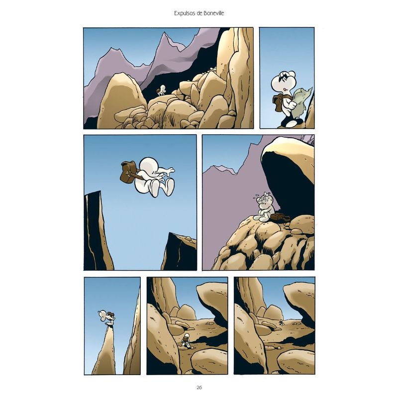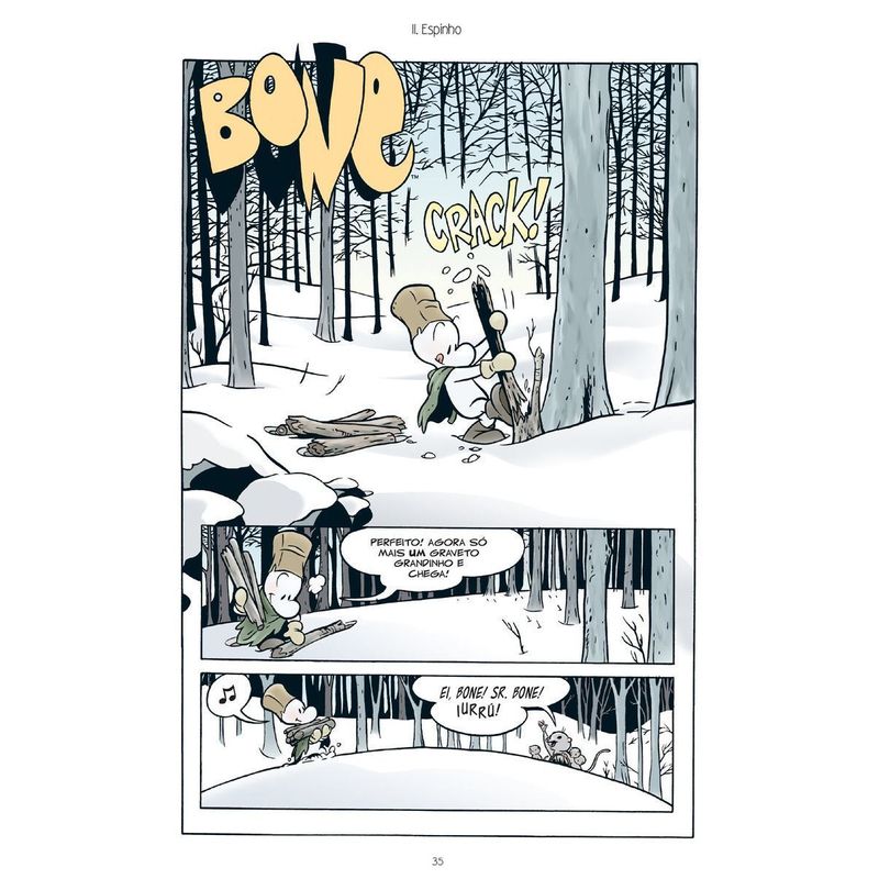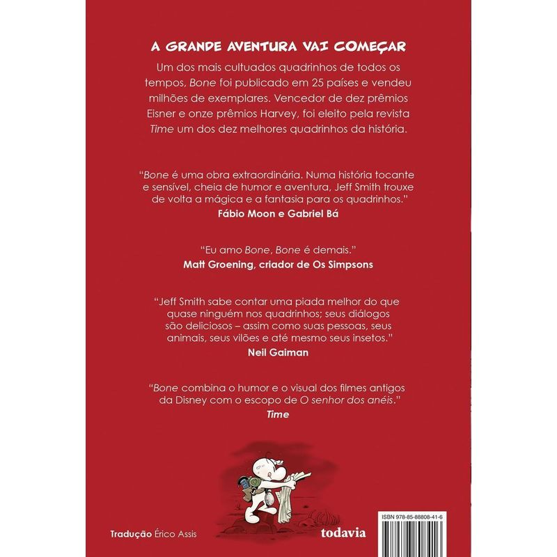 Um dos mais cultuados quadrinhos de todos os tempos, “Bone” foi publicado em 25 países, vendeu milhões de exemplares e ganhou dezenas de prêmios. A grande aventura vai começar. Expulsos da cidade de Boneville, os primos Fone, Phoney e Smiley se veem perdidos num enorme deserto. Eles acabam chegando ao Vale, uma região misteriosa e repleta de criaturas fantásticas. Ao lado da garota Espinho, da vovó Ben e do Grande Dragão Vermelho, os primos se verão embrenhados em um conflito entre os cidadãos de Vale e um exército de ratazanas liderado pelo temível Kingdok. Ao mesmo tempo, forças infinitamente mais tenebrosas parecem ressurgir das sombras e uma grande guerra se anuncia no horizonte. Esta edição reúne os três primeiros volumes da saga vencedora de dez prêmios Eisner e onze prêmios Harvey.