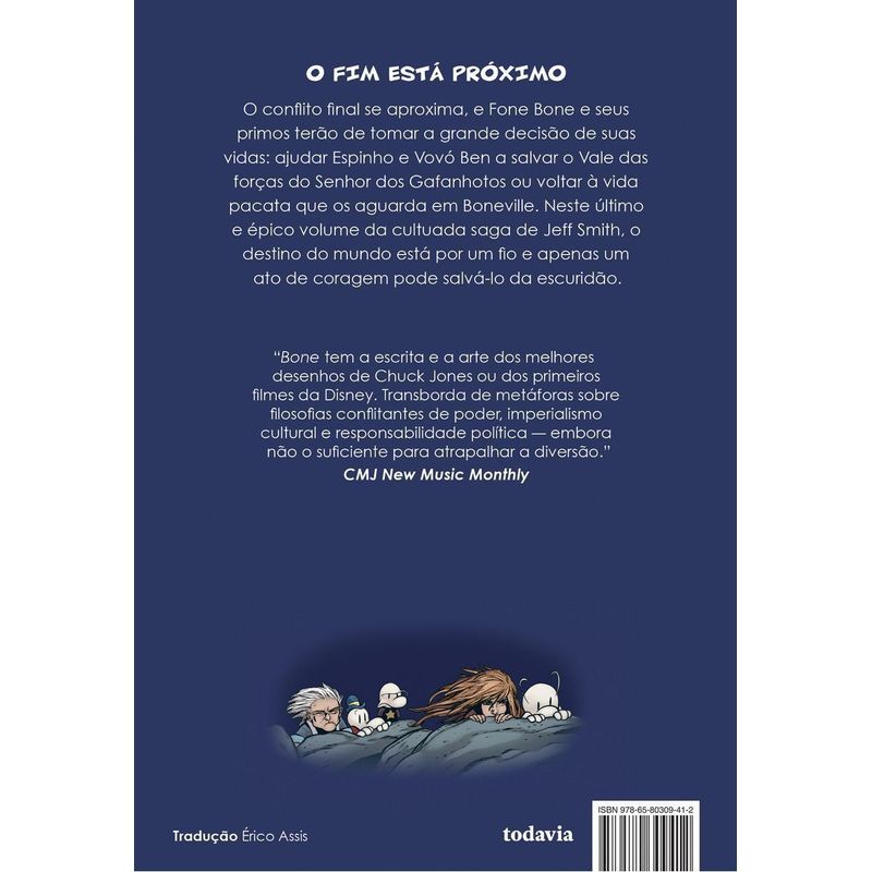 A esperadíssima conclusão da saga Bone. No terceiro volume deste clássico dos quadrinhos, o senhor dos gafanhotos e seus asseclas ganham força e estão prontos para o ataque final. Se conquistarem o reino de Atheia, nada mais restará para deter a escuridão que se aproxima do Vale. Todas as esperanças agora recaem sobre os ombros de Fone Bone, Espinho e da Vovó Ben, mas a batalha com o Encapuzado lançou os temíveis círculos fantasma sobre o Vale, e a travessia até a capital torna-se mais perigosa a cada minuto. Enquanto Atheia se prepara para a guerra que decidirá o destino de todos, os Bones e seus amigos precisam reorganizar suas forças e enfrentar aqueles que agora controlam o reino. Na explosiva conclusão da saga de Jeff Smith, que chega pela primeira vez aos leitores brasileiros, os três primos colocarão à prova a ideia de que a menor e mais inesperada pessoa pode mudar o destino de todos.