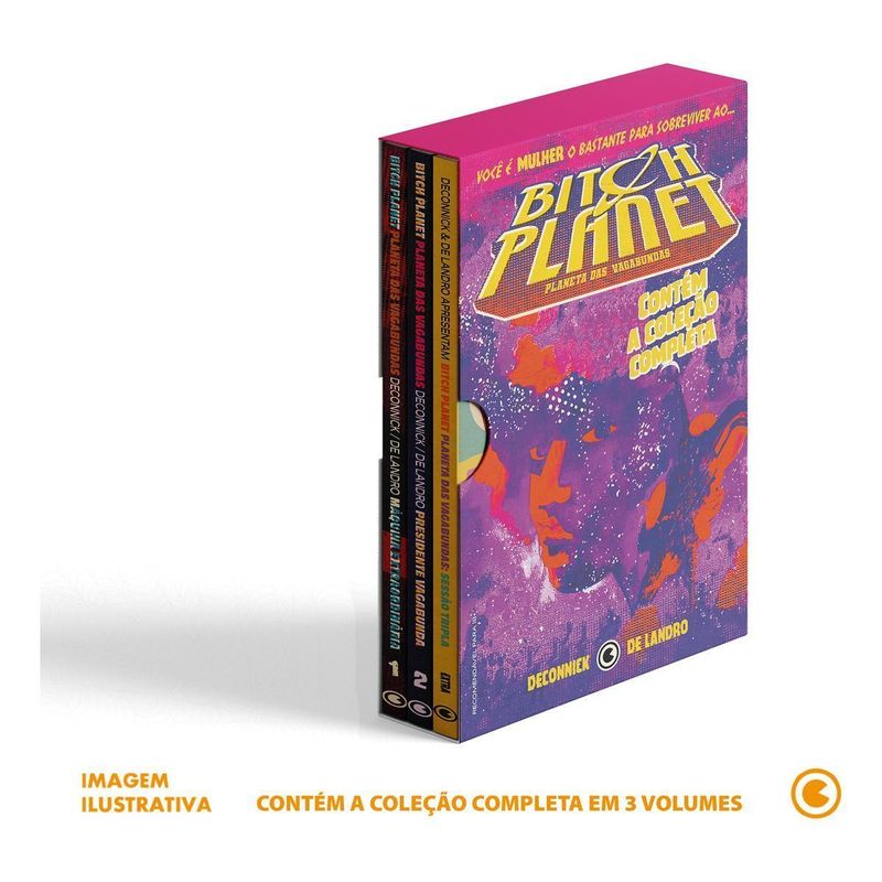 “Box completo com os três volumes de Bitch Planet – Planeta das Vagabundas, uma ficção científica deliciosamente cruel e real sobre o patriarcado criada por Kelly Sue DeConnick e Valentine De Landro. Num futuro distópico, apenas alguns anos à frente, na direção errada, o fracasso de uma mulher em obedecer aos seus senhores patriarcais resultará em um exílio no planeta penal mais cruel da galáxia. Quando a mais nova safra de mulheres chegar, elas poderão trabalhar juntas para permanecerem vivas ou será que agendas ocultas, guardas desonestos e o esporte mais mortal dentro (ou fora!) da Terra as levarão ao seu criador? Aperte o cinto, docinho: não pegamos leve em Bitch Planet – Planeta das Vagabundas. A trama se conclui nos dois primeiros volumes e a caixa ainda vem com mais um volume de histórias extras do mesmo universo, que revelam outras facetas cruéis dessa sociedade patriarcal. Completo em três volumes. “