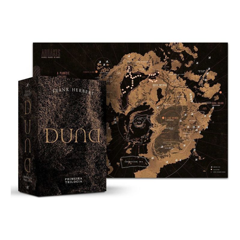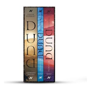 O Box Duna: primeira trilogia é formado pelos livros iniciais da saga – Duna, Messias de Duna e Filhos de Duna –, acompanhando a trajetória de Paul Atreides e sua família no planeta Arrakis. Uma estonteante mistura de aventura e misticismo, ecologia e política, a Série Duna é uma das mais épicas histórias de toda a ficção científica. Um triunfo da imaginação que influenciará a literatura para sempre. Uma estonteante mistura de aventura e misticismo, ecologia e política, este romance ganhador dos prêmios Hugo e Nebula deu início a uma das mais épicas histórias de toda a ficção científica. Duna é um triunfo da imaginação, que influenciará a literatura para sempre.Esta edição inédita, com introdução de Neil Gaiman, apresenta ao leitor o universo fantástico criado por Herbert e que será adaptado ao cinema por Denis Villeneuve, diretor de A chegada e de Blade Runner 2. Doze anos se passaram desde que Paul Atreides ascendeu ao trono e acumulou os títulos de imperador e messias. Líder do maior império que a humanidade já viu, Paul está terrivelmente consciente do peso de suas decisões. Arrakis tornou-se o centro do Imperium, de onde os fremen se propagaram a fim de levar sua filosofia e forma de governar aos planetas por eles conquistados. Os inevitáveis conflitos gerados por essa expansão fazem importantes facções contrárias ao imperador reunirem forças para detê-lo. Uma grande disputa está prestes a ter início nos bastidores do poder, e apenas Muad’Dib pode decidir o destino de todos. Messias de Duna é o segundo volume da série criada por frank herbert. Ele revela um lado mais humano de seus personagens, além de aprofundar e estender o universo de Duna, aliando discussões políticas, filosóficas e religiosas à épica história de poder, vingança e redenção. O Imperium vive um interregno após Paul Atreides abdicar de seu título de imperador e entregar-se ao deserto. Sua irmã, Alia, ascende ao poder como regente enquanto os filhos de Muad’Dib não são capazes de assumir o Trono do Leão. Herdeiros não só do poder político e econômico de seu pai, os gêmeos também carregam em suas veias toda a carga genética manipulada por séculos pela Irmandade Bene Gesserit. Mas a hegemonia dos Atreides está ameaçada.